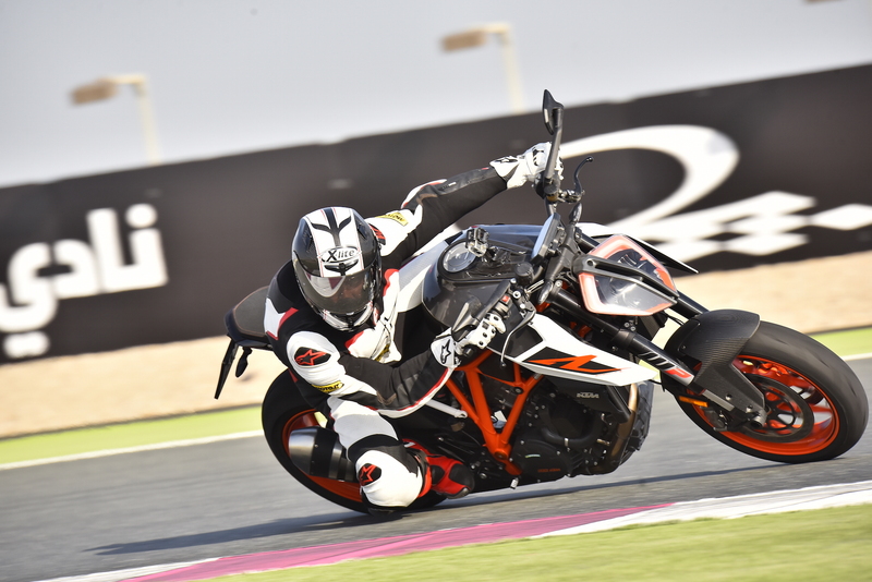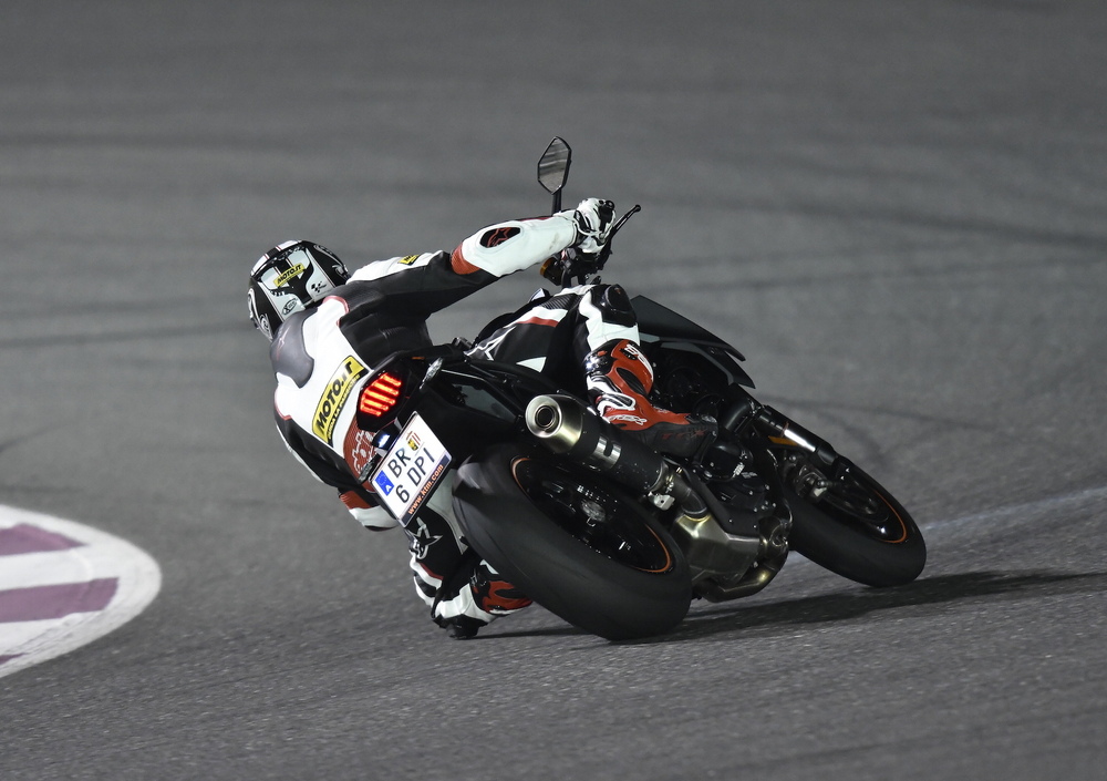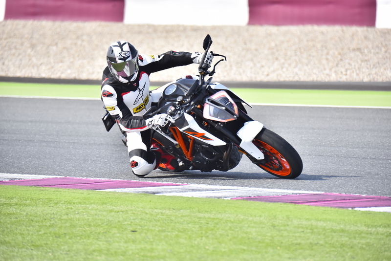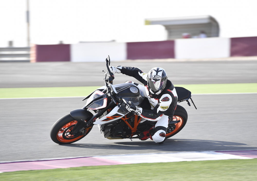La prima sessione sul tracciato di Losail si consuma in un mix di prese di contatto, moto, gomme e traiettorie, e la questione non è delle più semplici, soprattutto quando ci sono quasi centottanta cavalli scalpitanti sotto le chiappe e una coppia che si diverte a prendere a calci il pilota e tenta in ogni modo di strappare il pneumatico posteriore. Il breve giro fatto ieri per le strade di Doha, con lo scopo di fare due foto ambientate, ha strappato un meritato consenso viste le caratteristiche di guidabilità e fruibilità della Super Duke R, che come la precedente versione si dimostra a suo agio nell’uso prettamente stradale. Solo entrando in pista, però, si riesce ad apprezzare appieno il potenziale e il carattere della “Bestia”, una moto che secondo gli uomini KTM, ha due anime, una buona per l’uso tutti i giorni, l’altra racing e bastarda.
