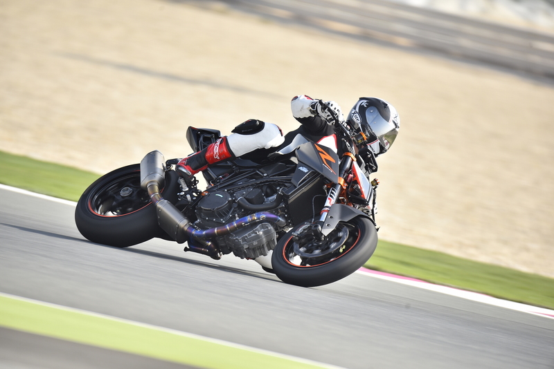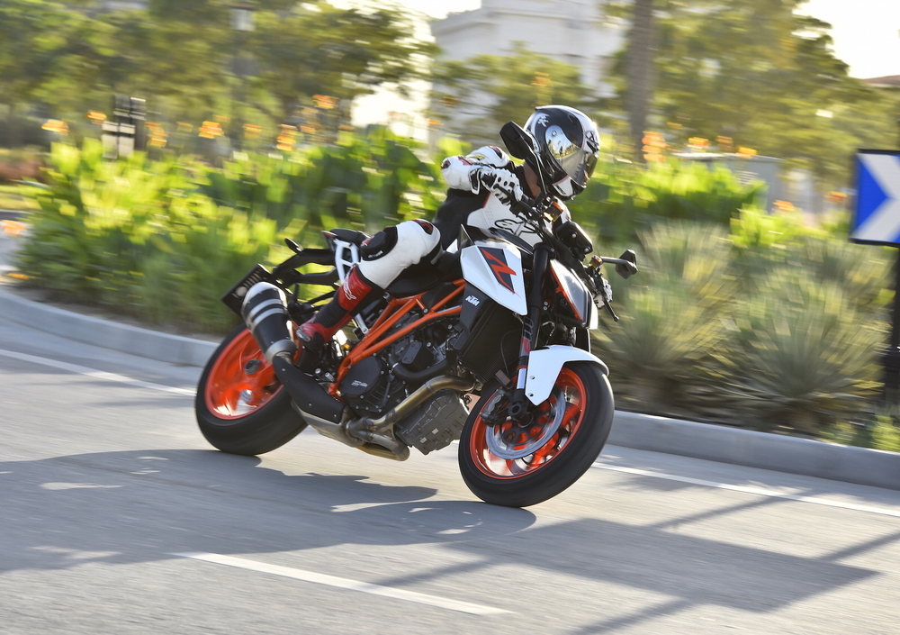 Facile e intuitiva, certo, poi prendi in mano il gas come si deve e lei inizia a scapparti da sotto le terga come una furia selvaggia. Tu tenti di stringerti a lei, con le pedane racing riesci anche a puntarti meglio e caricare l’anteriore che si alleggerisce con la stessa velocità con cui prende i giri il bicilindrico austriaco. Poi in men che non si dica arriva il momento di frenare, e non puoi che apprezzare l’ampio manubrio su cui puntarsi per benino, e al tempo stesso la potenza dell’impianto frenante, con il Cornering ABS che fa sentire la sua protezione quando si esagera davvero e si entra con i freni ancora pinzati fin dentro la curva, magari con la moto piegata al limite.