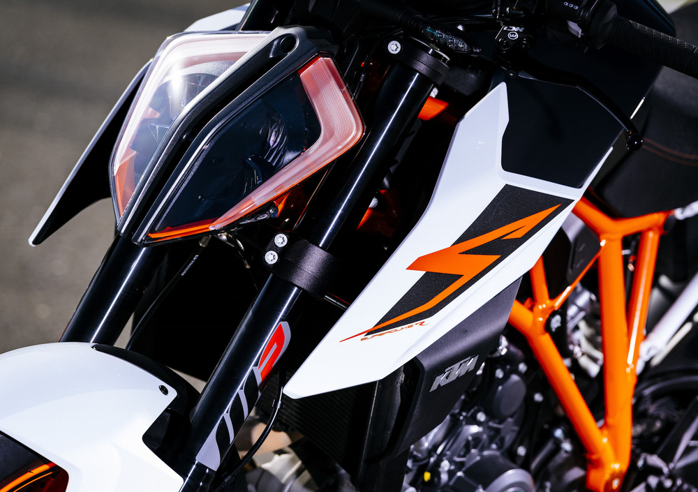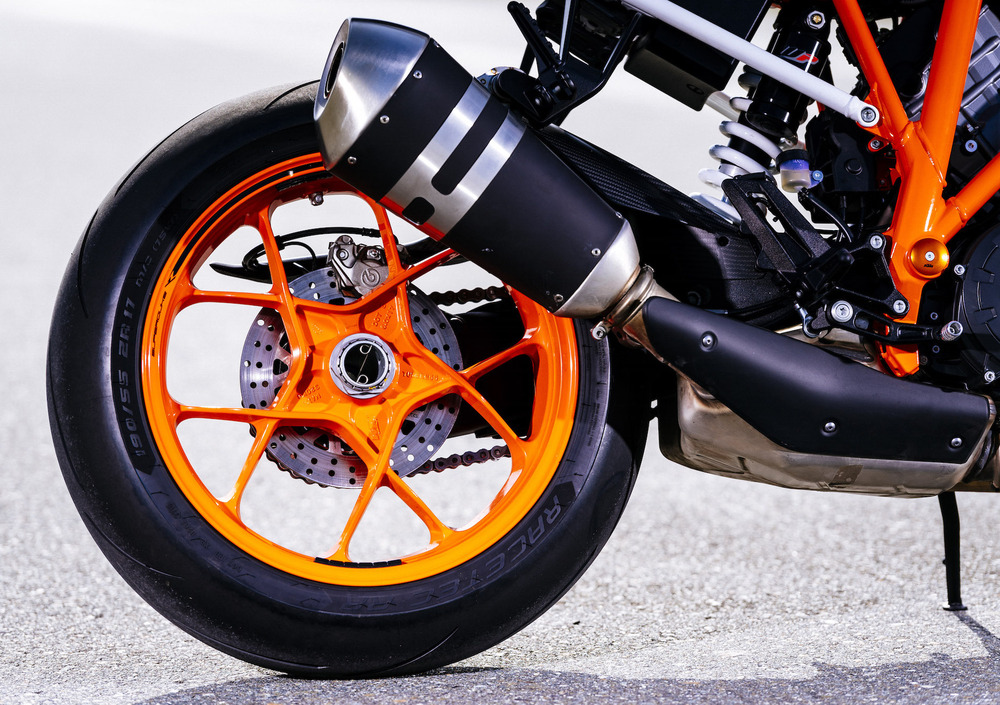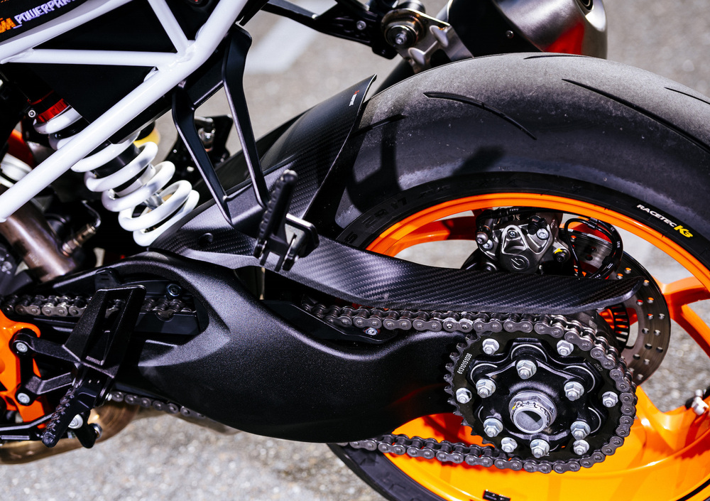 Come da tradizione KTM, gli accessori per personalizzare anche questa Super Duke R sono numerosi, si va da quelli meramente estetici, come i parafanghi in fibra di carbonio e i tappi serbatoi freni/frizione in ergal, a quelli più tecnici come lo scarico Akrapovič, i coperchi motore sempre in fibra di carbonio, le pedane arretrate e la sella Race con relativo codino monoposto. Inoltre sono disponibili anche i dischi a margherita, le protezioni per le leve al manubrio e una serie di articoli di abbigliamento dedicati. Ci viene da dire che non manca proprio nulla!