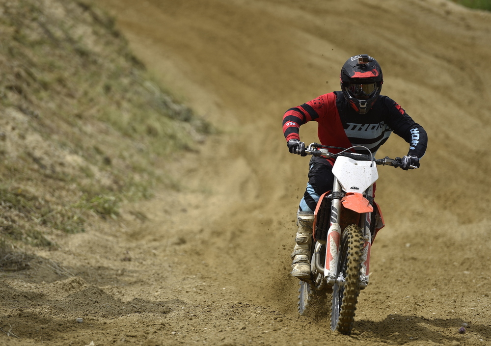 Già era leggera di suo, ora lo è diventata ancora di più. Più snella tra le gambe, più precisa e con un motore "elettrico", ma allo stesso tempo pieno e corposo, questa classica a due tempi stupisce sempre. KTM rimane fedele al Mikuni da 38 mm sulla versione cross per questioni di peso e semplicità di struttura, e infatti, una volta individuato il setting di carburazione giusto per la pista, questo propulsore gira che è un vero piacere. La nuova marmitta è sensibilmente più stretta, e te ne puoi davvero dimenticare, specie nei canali profondi generati dalle grosse cilindrate a quattro tempi.