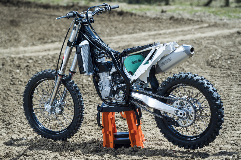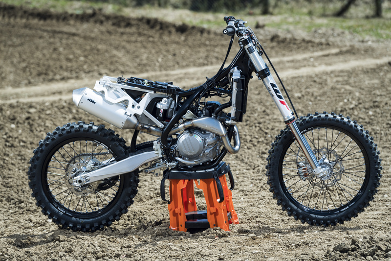 KTM 250 SX: il motoreè stato ruotato di un grado e dotato di una nuova marmitta super sottile, che permette una riduzione d’ingombro di oltre 25 mm sul lato sinistro al fine di ridurre le piegature senza perdere in performance. Questo perché ormai tutti i piloti si sono abituati a non avere la marmitta e la schiacciano facilmente. L’esperienza in Motogp ha permesso di scoprire come sviluppare le curve con sezione ovale in modo da non velocizzare il flusso degli scarichi, ed ottenere quindi una riduzione di ingombro senza perdere potenza.Grazie alla nuova sequenza di sviluppo, questa previsione ha fruttato un prototipo software seguito da un calcolo fluidodinamico e da un prototipo con la stampante 3D: dopo averla provata, la nuova marmitta è stata introdotta con successo nella produzione di serie. Questo ciclo impiega più o meno 18 mesi, e diventa il doppio più veloce e cinque volte più accurato di quello del precedente.