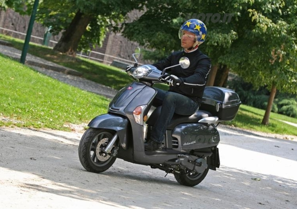 Semplice e senza troppi fronzoli la ciclistica, idem per il motore, naturalmente omologato Euro-3: un 4 tempi da 9,5 cv a 8.000 giri raffreddato ad aria forzata, con testata monoalbero in testa a due valvole, alimentato tramite un carburatore marcato Kymco con diffusore da 22 mm di diametro pescando da un serbatoio da 6,5 litri. Come spesso accade sui motori da scooter di piccola cilindrata, qui abbiamo sia l’avviamento elettrico che quello a pedivella, fondamentale nel caso la batteria esalasse l’ultimo respiro e non si disponesse dei provvidenziali cavi (e di un’altra batteria di un’auto o di una moto cui collegarli, chiaramente): è superfluo, infatti, ricordare che la trasmissione è automatica a variatore continuo, il che rende assolutamente patetico tentare l’avviamento a spinta.