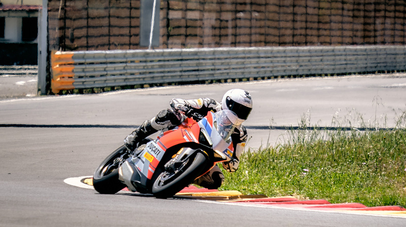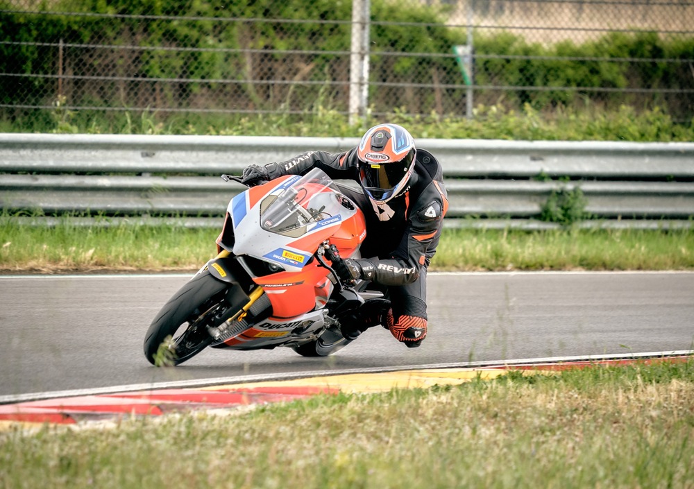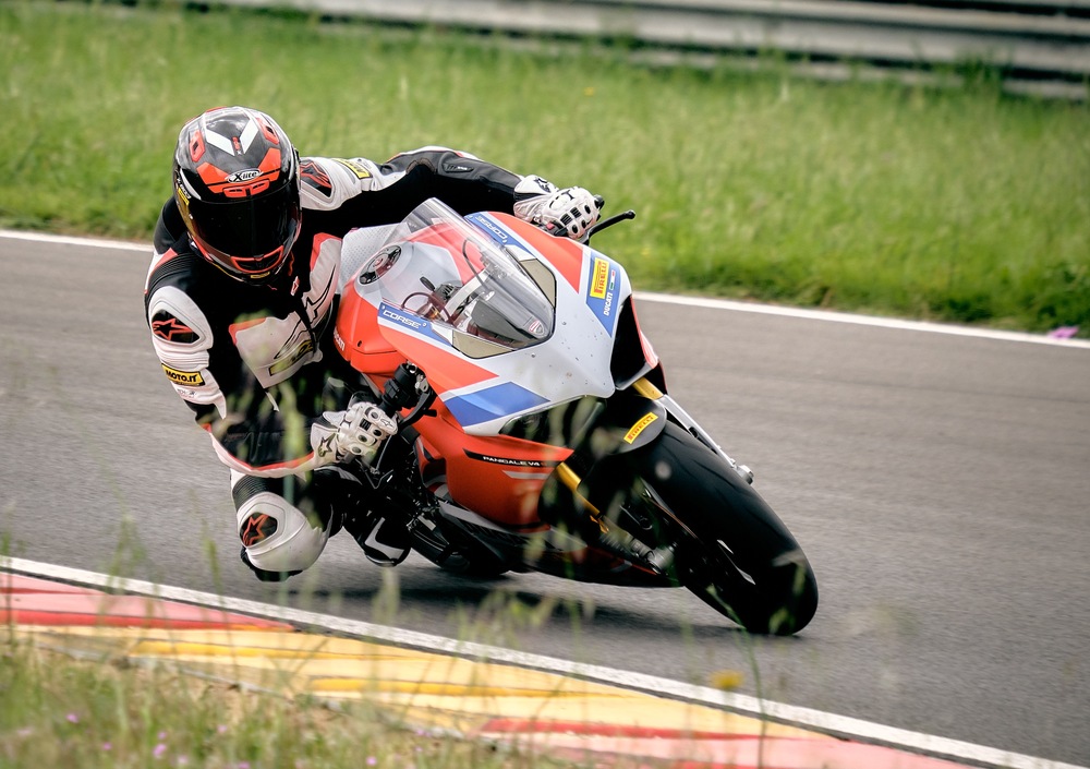La V4 Ducati ha un’agilità sorprendente, è velocissima nell’ingresso di curva e permette di ritardare tanto la frenata rispetto alle altre rivali, senza che l’avantreno si scomponga quando si rilasciano i freni. Più si entra forte in curva e più si scopre che si può osare di più: è un'autentica belva da pista pensata per funzionare a ritmi da gara. Fra l’altro la frenata è davvero molto potente e sposta più avanti il classico riferimento di staccata nonostante ci si arrivi spesso con maggiore velocità, con un affondamento marcato ma preciso della forcella. Staccando così forte si sente però la necessità di avere maggiore appoggio da parte del serbatoio per alleggerire una parte del carico sulle braccia.