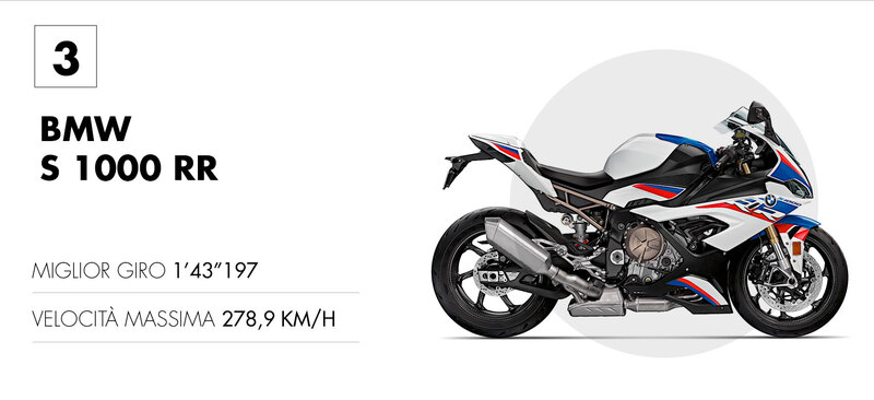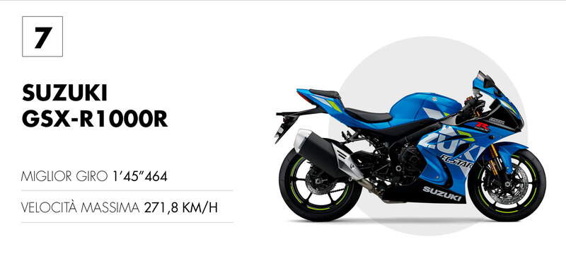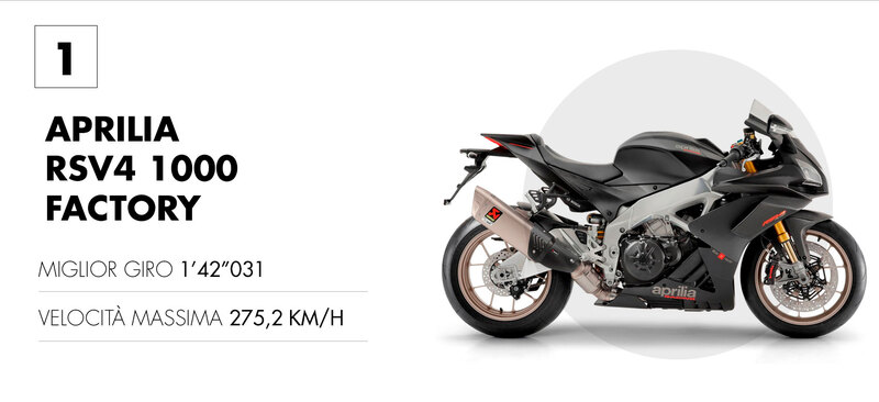 Nel terzo, infine, le sottoponiamo all’implacabile giudizio del cronometro. Perché non ci stancheremo mai di ripetere quanto, all’atto pratico, contino i tempi che sanno staccare queste moto nelle mani di un pilota rispetto al racconto delle caratteristiche dinamiche, che invece vi permette di scegliere la moto che più fa per voi, ma… lo sappiamo, i riferimenti cronologici hanno il loro fascino. E quindi, dopo aver gommato le sette belve con le slick Pirelli Diablo Superbike SC1, abbiamo scatenato anche quest’anno Alfio Tricomi e abbiamo stilato una classifica.