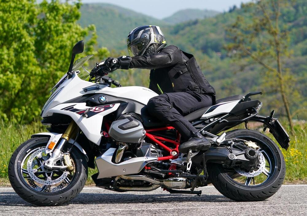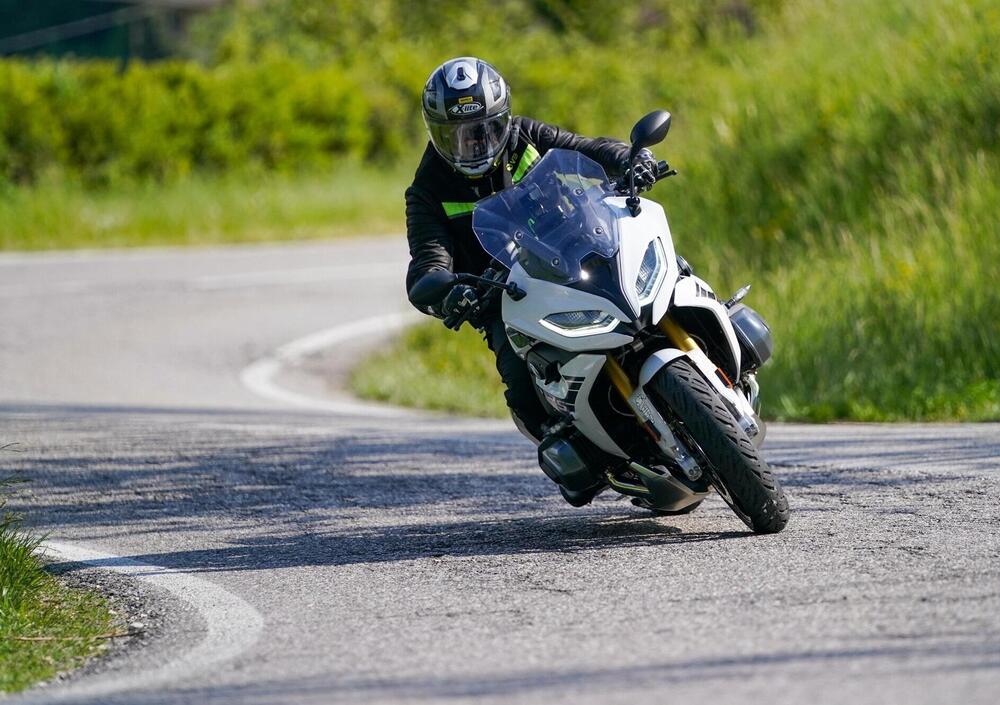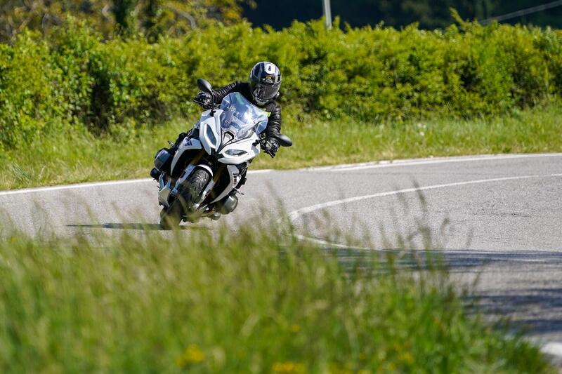 Anche ritardando le frenate fino a centro curva e mollando poi la leva del freno, non abbiamo registrato scompensi di assetto, e solo ai massimi angoli di piega alla guida della BMW R1250 RT, abbiamo registrato una leggera tendenza a raddrizzare l'avantreno.