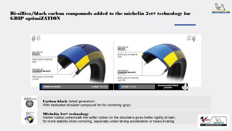 Per descrivere le nuove Michelin Power GP2 partiamo subito da quello che si vede dall'esterno: il battistrada presenta un rapporto vuoti/pieni del 6,5% con ampie fasce slick alle sue estremità. Per dare un'idea, lo stesso parametro per gli sportivissimi Power Cup (10 strada, 90% pista) è del 5%. Il battistrada è inoltre bimescola, con quella centrale più dura dove la concentrazione di silice è maggiore (sinonimo di maggiore resa chilometrica e grip sul bagnato) e quella apposta sui lati dove il carbon black la fa da padrone, per esaltare il grip in piega. Da notare la la tecnologia 2CT+ che vede la mescola centrale fare da base a quelle laterali è applicata soltanto al posteriore, mentre all'anteriore si è preferita una soluzione tradizionale.