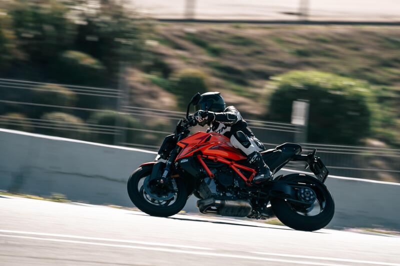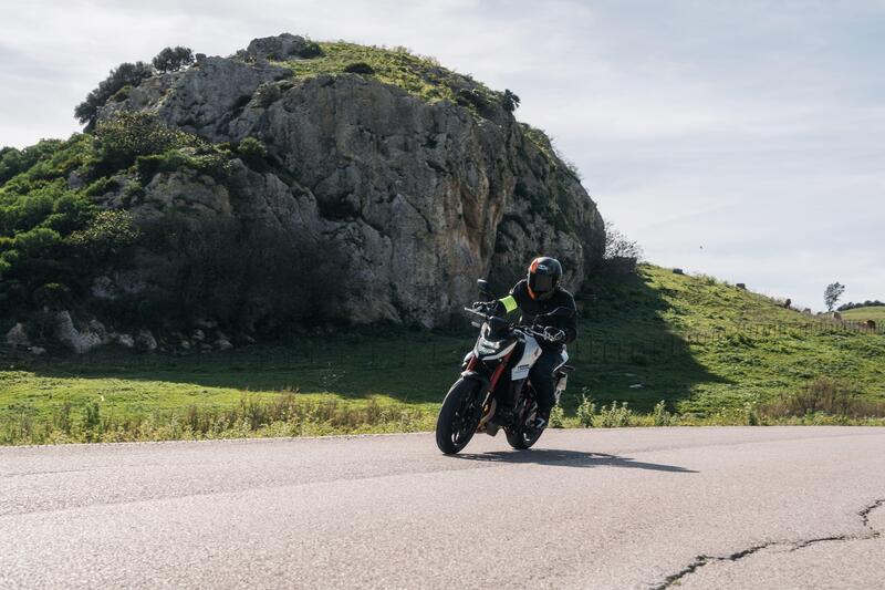 Molto diverse le Power GP2, ed è normale che sia così, rispetto alla Power 6. Qui la percentuale del 50% pista fa si che sul tracciato andaluso si possano esplorare i limiti delle ciclistiche in pieno controllo e sicurezza. Come già avevamo rilevato nella nsotra prova in Sicilia, il grip dell'anteriore sull'angolo è semplicemente straordinario - specie se si pensa che non stiamo parlando di gomme dedicate all'uso in circuito - e il grado di confidenza che si instaura con facilità porta velocemente a prendersi tante licenze in ingresso di curva e in percorrenza, memtre al posteriore le botte di coppia e di cavalli della S 1000 RR non impensieriscono più di tanto perché il retrotreno mantiene perfettamente la linea nelle lunghe percorrenze a gas spalancato e soltanto scendendo di mappatura TC si può notare qualche intervento dell'elettronica. Rimarchevole che su una moto decisamente sopra le righe per aggressività, reattività, potenza (ma diremmo quasi... brutalità nell'erogazione) come la KTM 1390 Super Duke R le Power GP2 non mostrino segni di cedimento, neppure un minimo di nervosismo al manubrio dove se c'è qualche oscillazione è da ascriversi più al pilota che tende ad agganciarsi al manubrio quando si dà tutto gas.