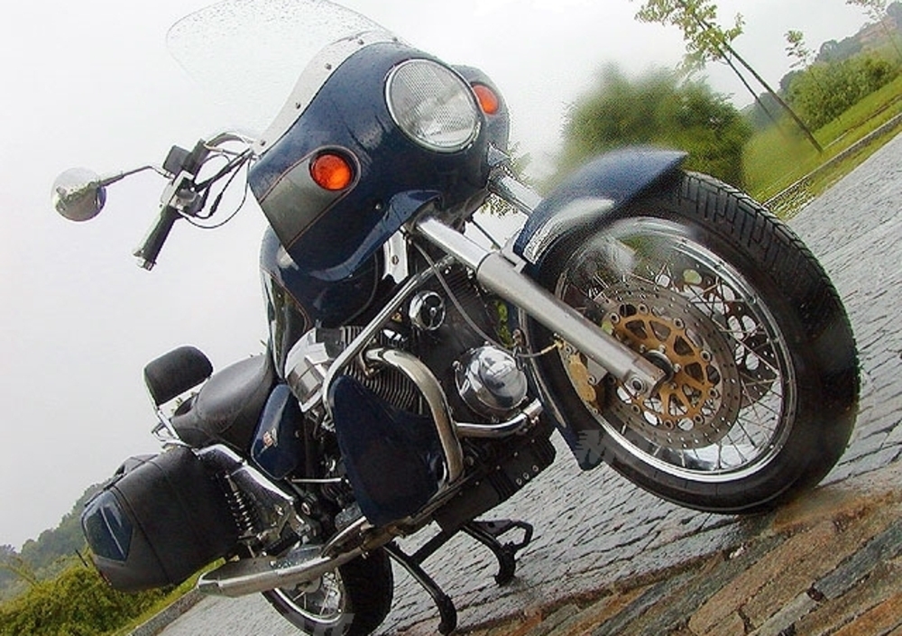 Da sottolineare la dotazione tutt’altro che customistica , per quanto concerne le sospensioni. Davanti troviamo una forcella idraulica Marzocchi da 45 mm regolabile separatamente, accoppiata ad un ammortizzatore di sterzo, mentre al posteriore sono montati due ammortizzatori idraulici, anch’essi regolabili.