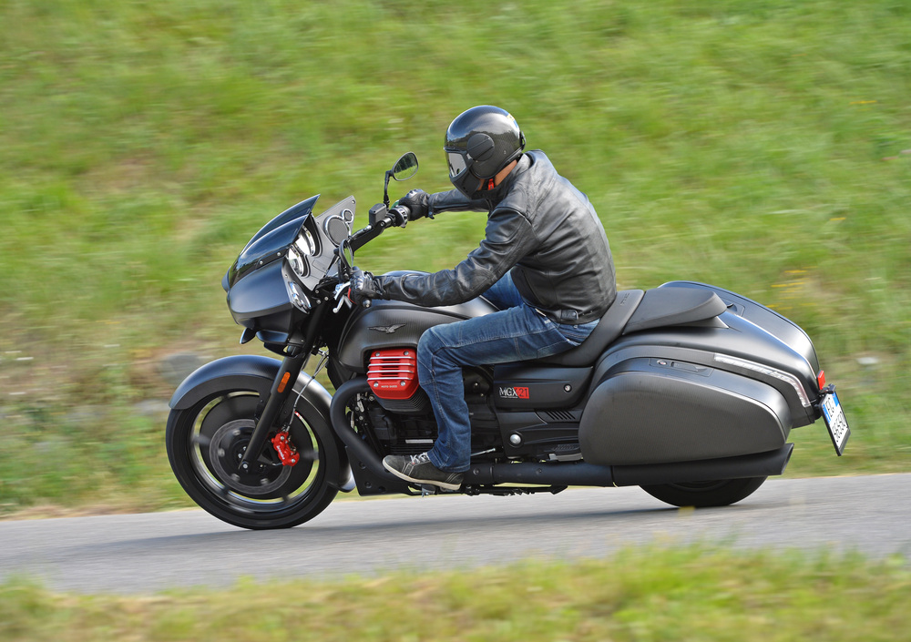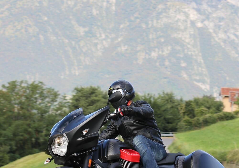 La nostra bagger non nasce certo per gironzolare in città, ma la conoscenza della MGX-21 inizia proprio qui, nella Milano dell'ora di punta. E sulle prime ci spiazza. L’approccio richiede un po’ di chilometri di apprendistato. Vi spieghiamo perché. La sella è bassa (740 mm), ma il peso di 341 kg (a cui aggiungere quello dei 20 litri di benzina) rende la guida a bassa andatura piuttosto impegnativa. La MGX-21 è parente della facile California 1400 che conoscete tutti, ma la ruota da 21 (con pneumatico 120/70, mentre dietro c’è un 180/60 da 16") limita la maneggevolezza sotto i 40 orari. E' sufficiente abbandonare il traffico per ritrovare la bella guida della maxi cruiser italiana. Proseguiamo quindi il nostro test in direzione della Brianza prima e del Lago di Como poi, su strade più congeniali alla nostra bagger.
