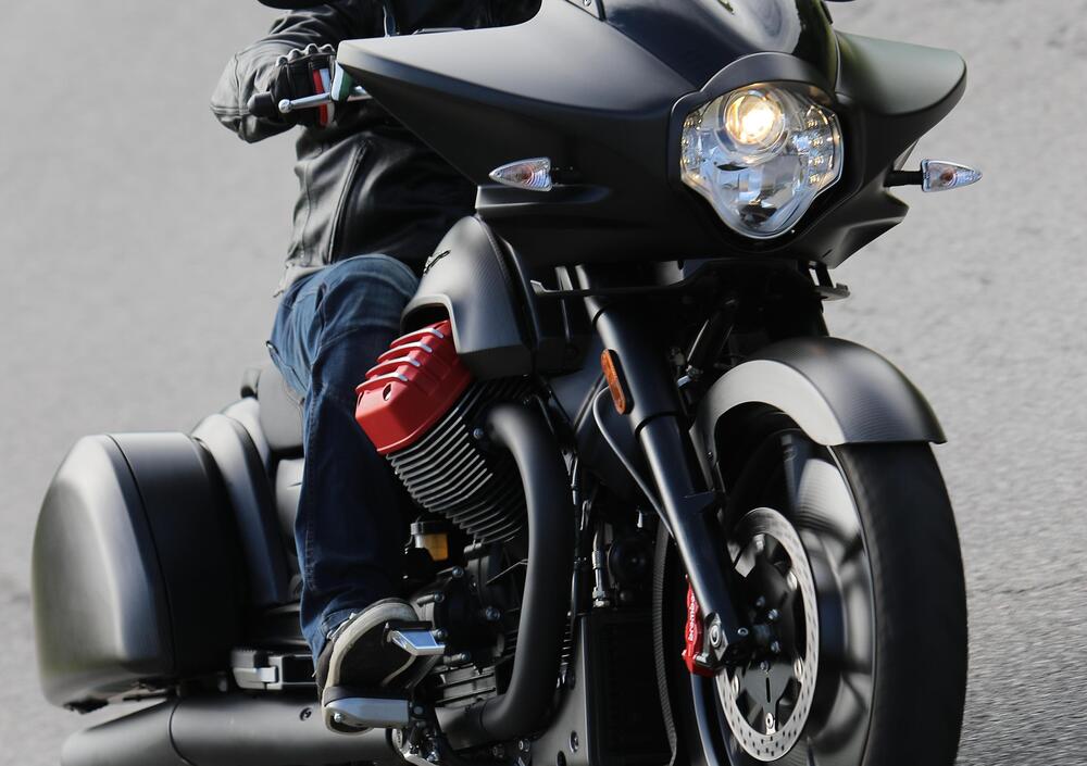 La nuova Moto Guzzi ha già raggiunto metà obiettivo ancor prima d'essere accesa. Ferma sul cavalletto, si presenta ai nostri occhi come una scultura di acciaio e di carbonio. Il mix tra questi due elementi è un vero spettacolo, che accentua le finiture pregevoli della MGX. Più la osservi e più ti convinci che in Guzzi siano stati bravi a contenere il prezzo (in effetti inferiore a quello della concorrenza americana e giapponese). Non c'è nulla fuori posto e ogni singolo componente in fibra è costruito con precisione e senza la minima sbavatura. Ma ora basta chiacchiere e diamo vita ai due enormi pistoni di Mandello.