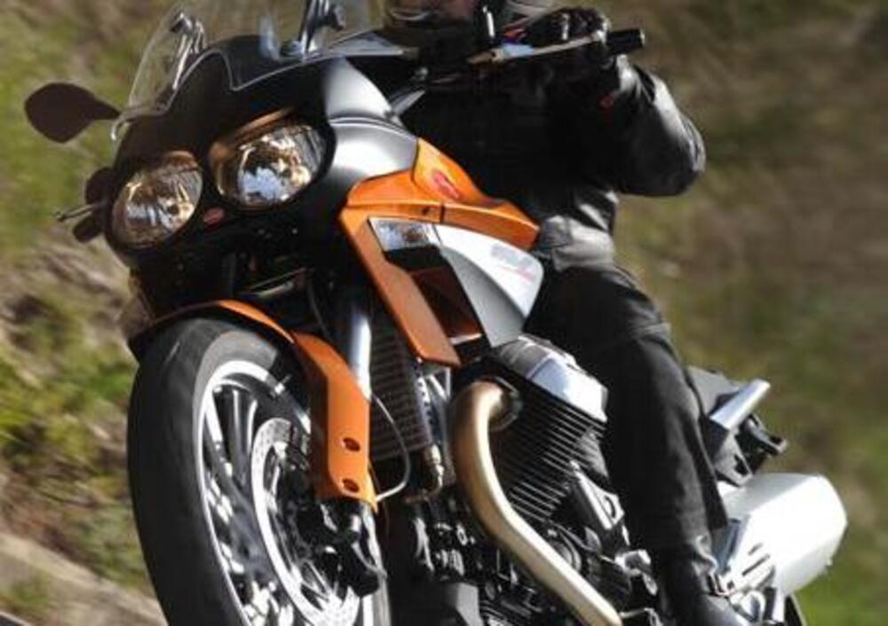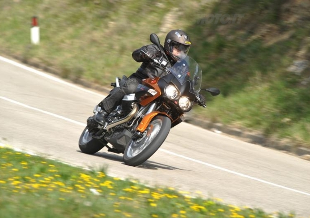 Il massiccio V2 trasversale a 90°, colonna portante della Casa di Mandello del Lario fin dai tempi della prima V7 – quindi da quasi mezzo secolo – in questa versione denominata “Quattrovalvole” (per cilindro), monoalbero in testa da 1.151 cc, non arriva per poco alla cavalleria del boxer BMW: per migliorarne la sfruttabilità rispetto al motore che debuttò sulla Griso, del resto, la potenza era stata diminuita dai precedenti 110 a 105 cavalli (77,2 kW) a 7.250 giri, contro i 110 cv (81 kW) a 7.750 giri del concorrente tedesco. Tuttavia il Guzzone si difende più che dignitosamente con la coppia motrice: 11,5 kgm (113 Nm) di picco a 5.800 giri, a fronte dei 12,2 kgm (120 Nm) a 6.000 del tedesco. Valori peraltro immutati, per il bicilindrico italiano, rispetto a quelli dichiarati nel 2009. In quest’ultima versione, però, è stata anche introdotta la seconda sonda lambda , il che ne ha migliorato ulteriormente il carattere: questo perché la nuova centralina integrata di iniezione ed accensione riceve dati più precisi, il che giova all’intero ciclo combustivo con conseguente riduzione dei consumi e delle emissioni nocive. Come già accennato, inoltre, è arrivato anche il controllo di trazione ATC, dal software non estremamente sofisticato, tarato principalmente per l’utilizzo su terreno bagnato e sullo sterrato leggero, e disinseribile dal cruscotto, ma a moto ferma. Immutato tutto il resto, dalla frizione monodisco al cambio a 6 marce, all’ormai noto Ca.R.C. (Cardano Reattivo Compatto) brevettato da Moto Guzzi.