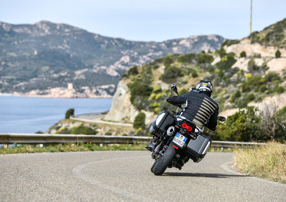La sella dista solo 83 cm da terra (ma esiste optional a 81 o 85 cm). Il peso a secco dichiarato corrisponde a 208 kg, quello in ordine di marcia resta quindi sotto i 230 effettivi. La Casa italiana ha già predisposto una lunga serie di accessori dedicata ai viaggi, che comprende le manopole riscaldate, il cupolino maggiorato, le borse in plastica o alluminio e lo scarico sportivo.