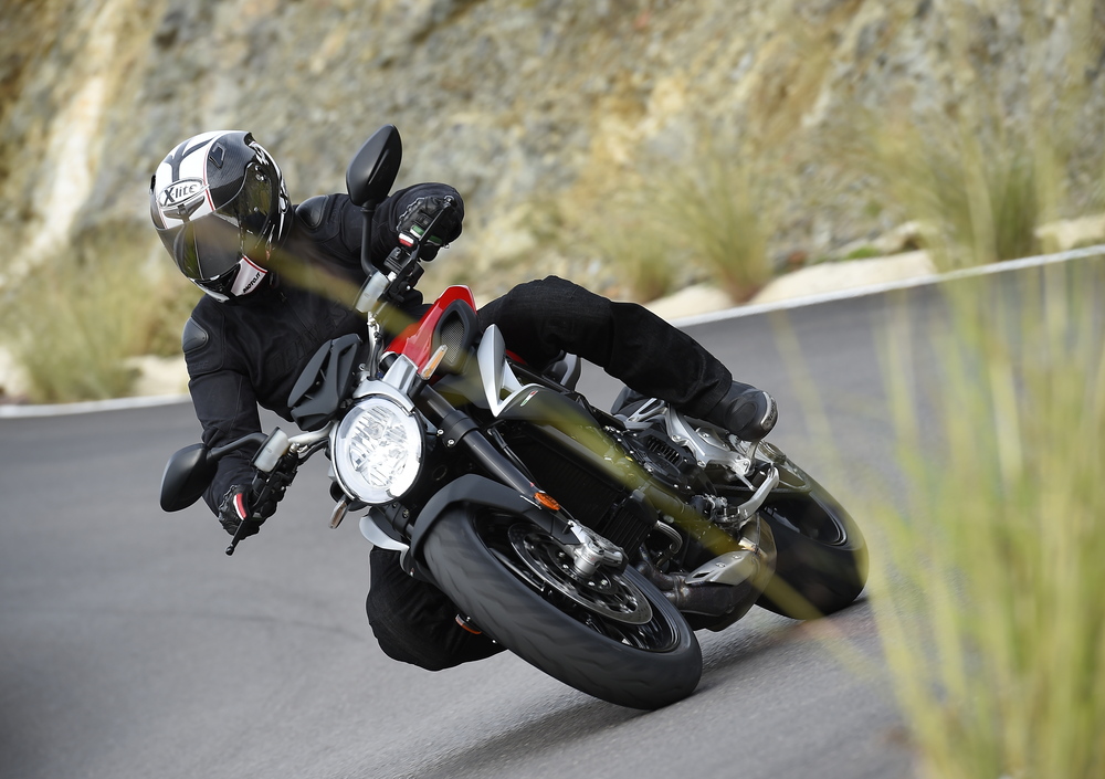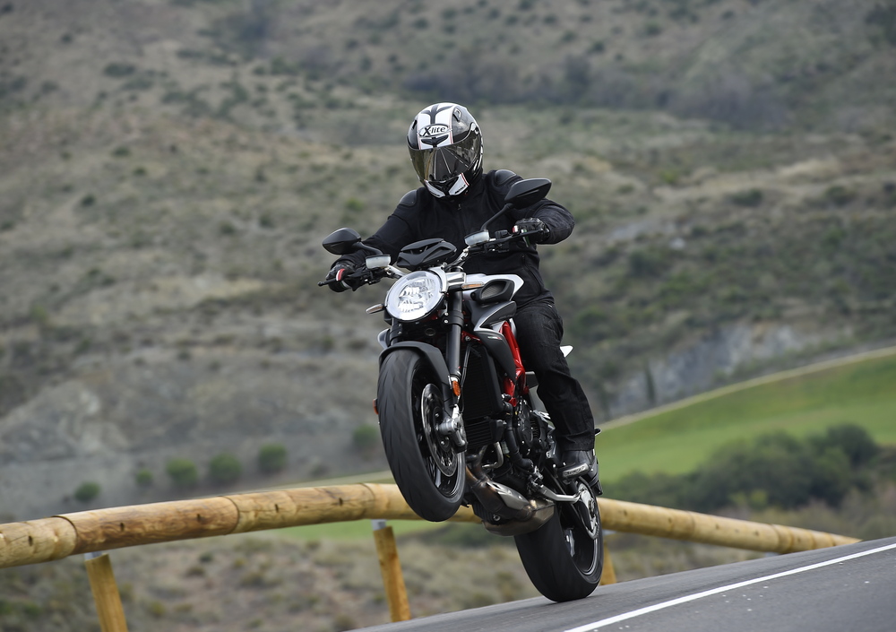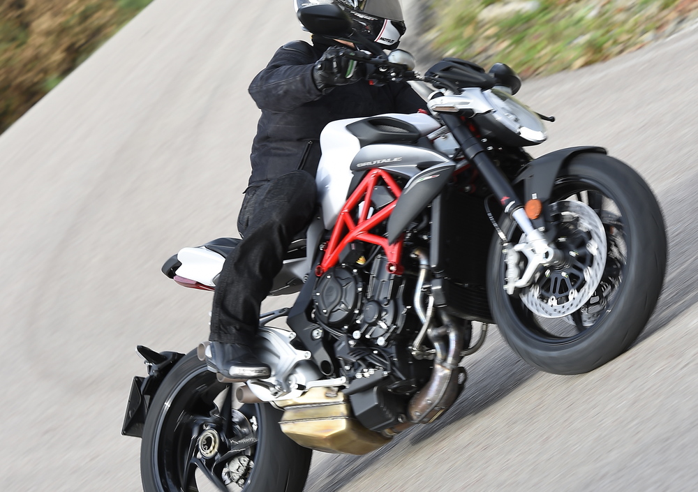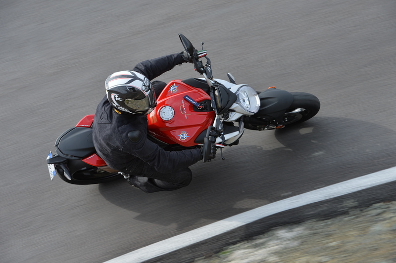 Tanta precisione nel copiare l’asfalto, unita alla leggerezza intrinseca della moto, con una ciclistica che per reattività non ha rivali, porta però la Brutale a essere una lama nel misto. Una lama a doppio taglio, finché si viaggia a ritmo blando senza chiedere tutto al mezzo, la Brutale 800 è una moto che potrebbe essere guidata anche da un neofita, che ne apprezzerebbe la leggerezza e il motore pastoso, se poi si comincia a esplorarne i limiti, allora è richiesta ancora una bella dose di pelo sullo stomaco. Siamo lontani anni luce dalla prima versione della “Ottocento”, ma un po’ di circospezione è ancora utile. Tanto per rendere l’idea bastano i 90 cavalli della mappa Normal, per viaggiare e sentire spingere, come se ce ne fossero molti di più a disposizione. Benedetta leggerezza!