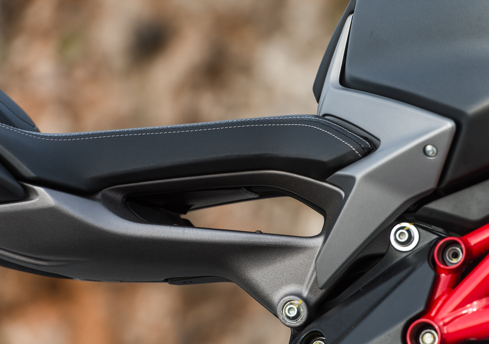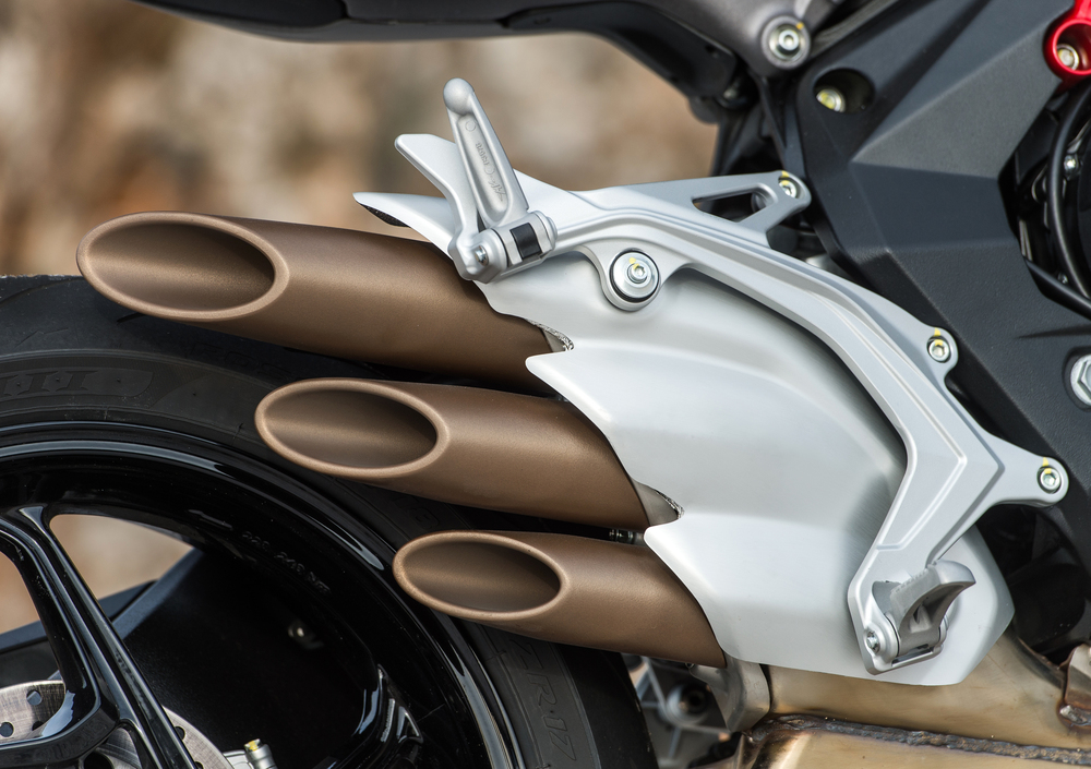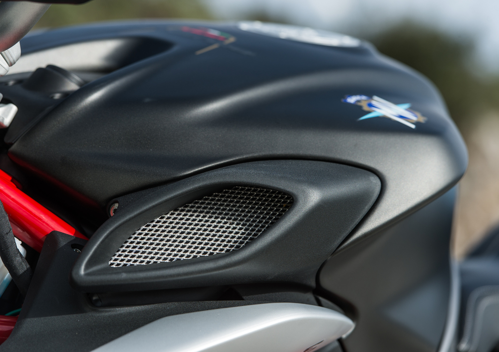 Che sia di rosso vestita, oppure in abito bianco o in versione total black, la nuova Brutale 800 strappa solo consensi. Curata sin nei minimi particolari, la tre cilindri italiana conquista al primo sguardo. Originale il nuovo codino, con quel foro d'alleggerimento che non ha precedenti se non quello della sorella Turismo Veloce, curatissime le piastre del faro anteriore, così come i convogliatori d'aria ai lati del serbatoio, e l'innesto del serbatoio stesso con la sella. Nulla appare fuori posto. Spariscono anche quei pochi tubi a vista sul lato destro del motore, raccolti e ordinati ora dietro il carter motore, mentre il regolatore di tensione è occultato dietro un carterino sul lato sinistro. Anche lo scarico, totalmente ridisegnato per soddisfare la normativa Euro 4, pur con un compensatore di maggiori dimensioni, non appare appesantito. Bella e ben fatta a guardare la cura degli accoppiamenti, le verniciature e la qualità dei materiali.