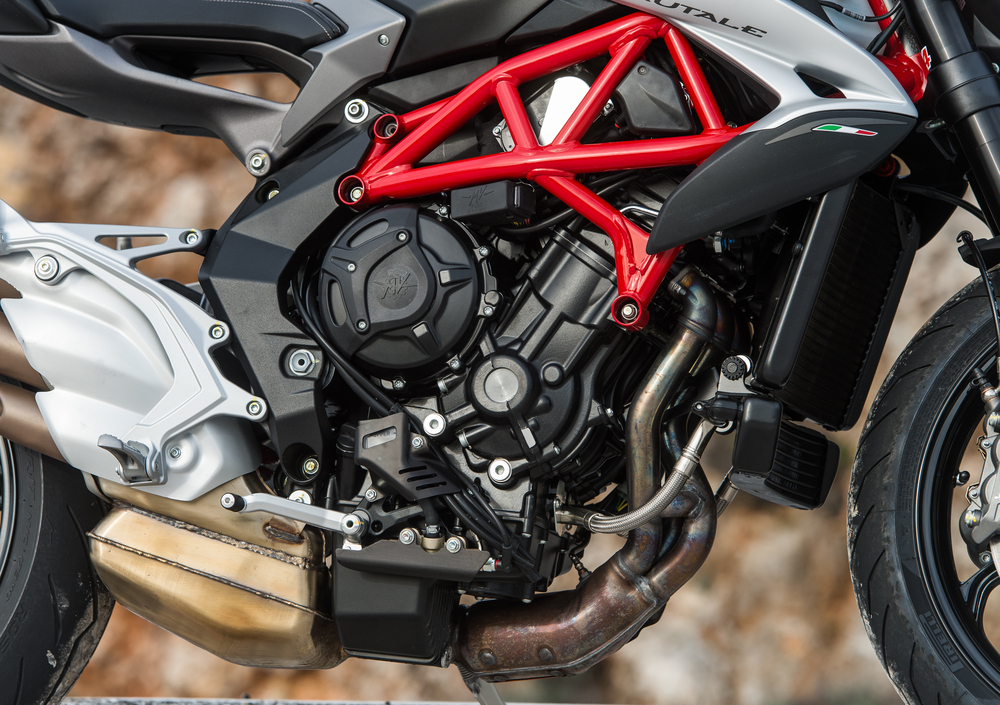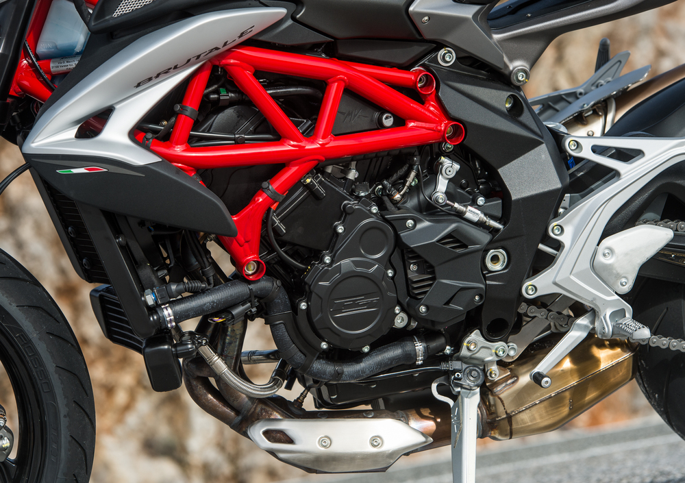 Il raffreddamento del bialbero 12 valvole è naturalmente a liquido con radiatori separati per acqua e olio, da sottolineare che entrambi i circuiti sono integrati nel motore, una peculiarità di questo propulsore, così come l'albero motore controrotante, che riduce in maniera significativa l'inerzia di guida, rendendo le tre cilindri di Varese estremamente rapide nei cambi di direzione. Il reparto trasmissione prevede ora un comando della frizione idraulico, con sistema anti saltellamento, mentre il cambio estraibile è stato rivisto nella rapportatura, con il vantaggio di poter contare su una sesta marcia più distesa, che abbassa il regime del motore da 7.100 a 6.400 giri alla velocità di crociera di 130 km/h, con benefici effetti anche sui consumi (-20% il dato dichiarato). Il cambio prevede di serie il sistema elettronico up&downEAS2.0 che come dice il nome, permette di cambiare senza frizione sia salendo di rapporto che scalando.