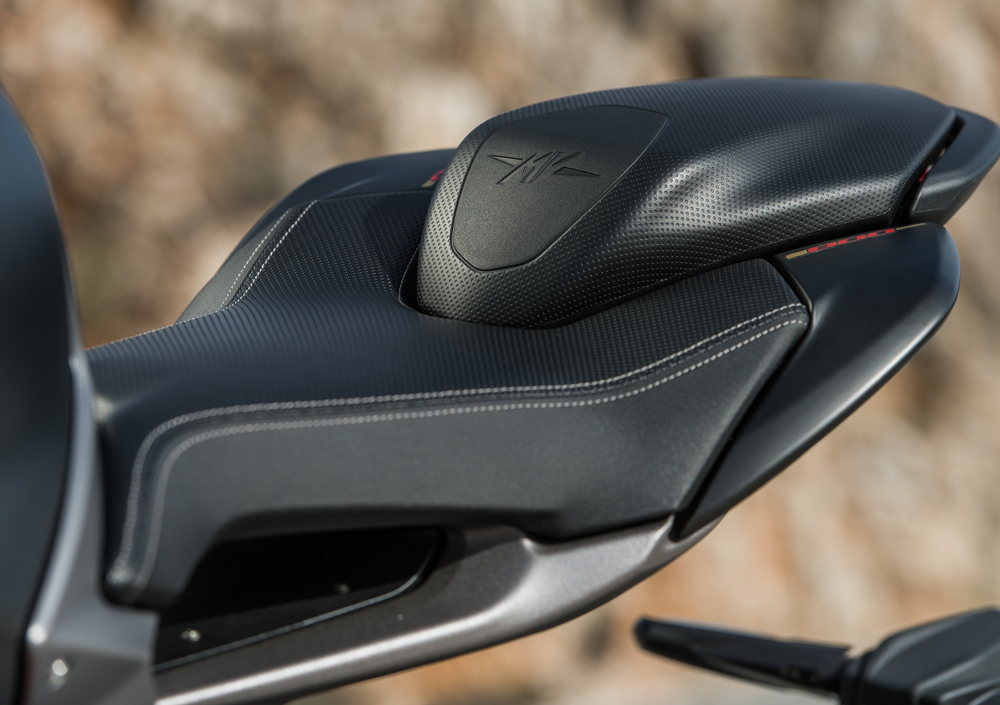 Il telaio mantiene le caratteristiche della precedente versione, quindi rimane un traliccio in acciaio ALS con piastra laterali e forcellone monobraccio fusi in lega d'alluminio, ma è stato rivisto in alcune quote per rendere la Brutale più lineare e stabile, soprattutto alle alte velocità (i suoi 116 cv la spingono fino a quasi 240 km/h). L'interasse si attesta sui 1.400 mm, quindi +20 mm rispetto a prima, così come l'avancorsa che cresce da 95 a 103.5 mm, e il cannotto di sterzo che si apre fino a 24.4 gradi. La lunghezza totale arriva così a 2.045 mm, mentre il peso dichiarato a secco è di soli 175 kg. Inedito il telaio reggi sella in lega leggera, composto da due elementi separati per il pilota e passeggero. Interessante la possibilità di variare la posizione della maniglia dedicata al passeggero, che può passare da una posizione di riposo, che la integra perfettamente al codino, a una "in uso", che ne permette l'arretramento di 50 mm, rendendone la presa più agevole.