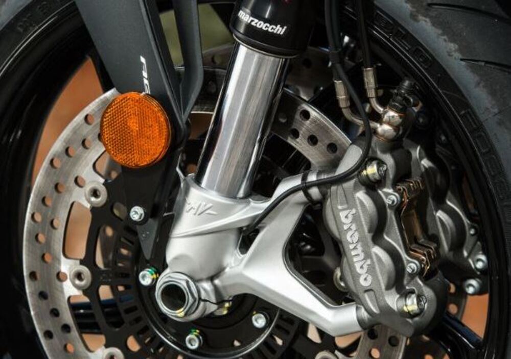 Per le sospensioni la casa varesina si è affidata a Marzocchi per la forcella da 43 mm a steli rovesciati, con regolazione separata (una per ogni stelo) per il freno in estensione e compressione. Ovviamente non manca il precarico molla, di cui è provvisto anche il mono Sachs, anch'esso completamente regolabile.