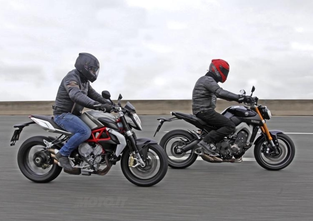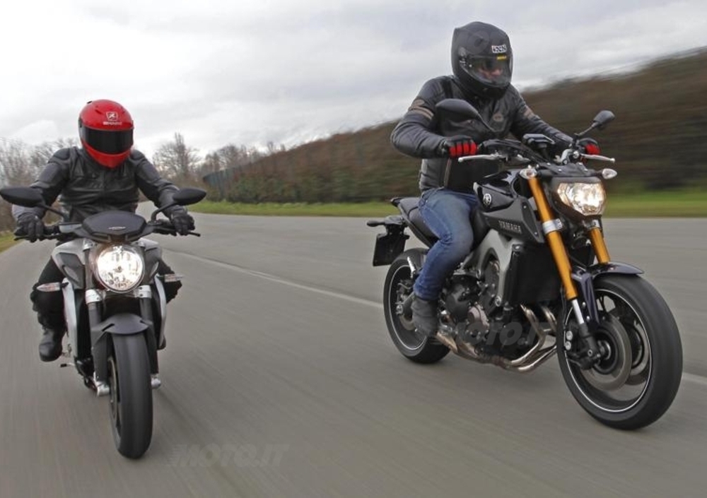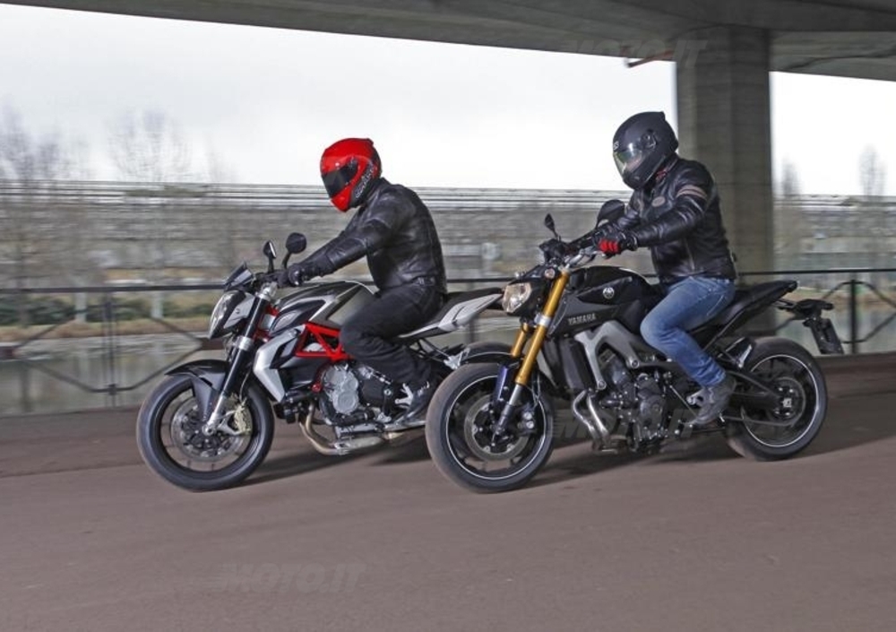 Sin dai primi chilometri, la Yamaha si dimostra più facile e intuitiva della MV Agusta, ma anche altrettanto agile. Il suo motore più rotondo e lineare nell'erogazione esalta questo aspetto, suffragato dalla trasmissione e dalla rapportatura del cambio. L'animo da fun bike dell’MT-09 è sempre ben presente, ed emerge spesso e volentieri, con l'avantreno che si alleggerisce e decolla con gran facilità sotto la spinta vigorosa del “3 cilindri” da 847 cc. L'effetto on/off del ride by wire, lampante nell'uso in mezzo al traffico, purtroppo non scompare uscendo dalla città, e infastidisce soprattutto nel misto stretto, mentre aumentando le velocità lo si nota meno: ma tale noioso difetto rende praticamente inutilizzabile la mappa A, caratterizzata da una maggiore reattività e rapidità di risposta della manopola del gas, che rende troppo aggressiva la prima parte di erogazione della potenza, mettendo spesso e volentieri in affanno le Bridgestone BT-020 in dotazione: e qui non c'è il controllo di trazione a metterci una pezza!
