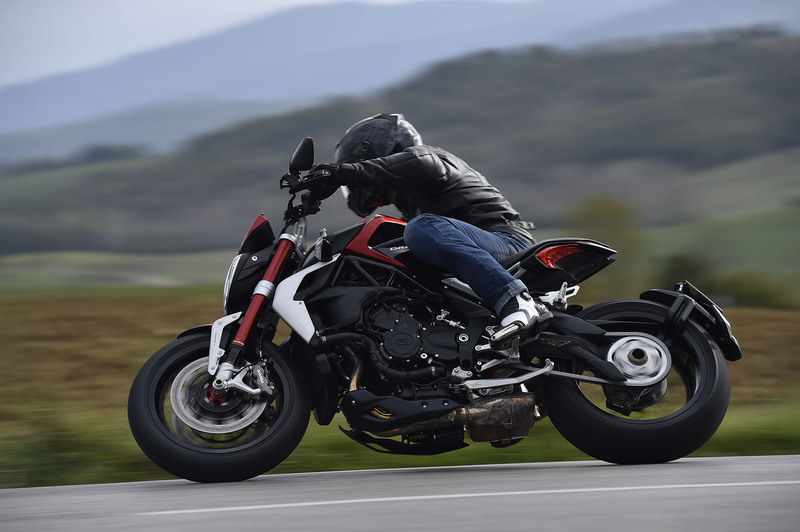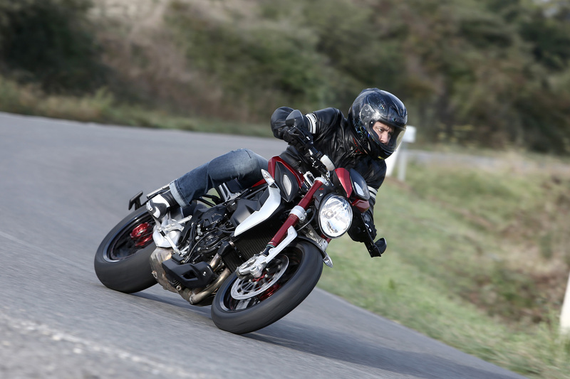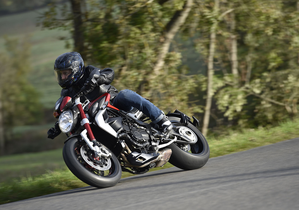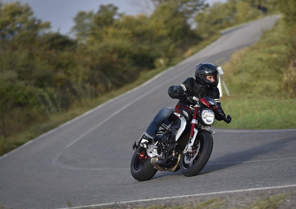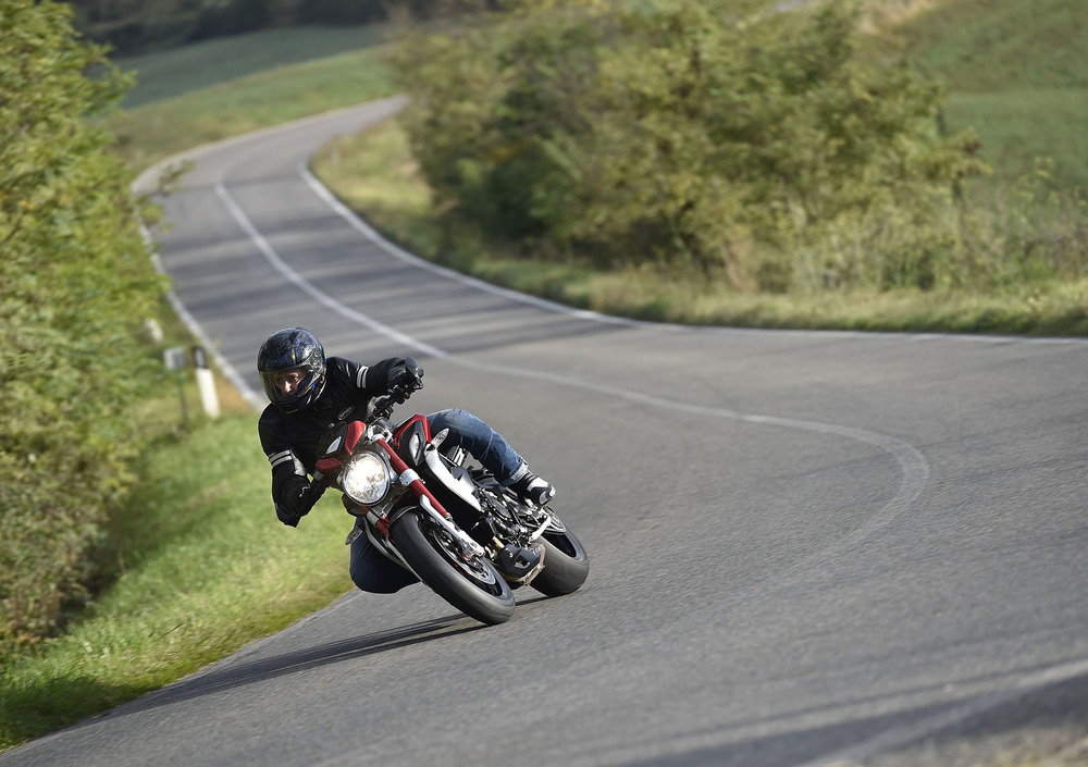 Spettacolo, all’esaltazione creata dal concerto del tre cilindri in accelerazione, si unisce la piacevolezza di scalare “alla brutta maniera” più rapporti, con la Dragster che risponde a suon di doppiette, mentre la frizione antisaltellamento gestisce al meglio il grip del posteriore. Tutto questo toglie gusto alla guida? Diciamo di no, anzi permette di concentrarsi al meglio sulla strada, o sulla pista (che nella prova precedente la Dragster ha tutt’altro che disdegnato), e vi assicuriamo che in sella a questa moto c’è poco da guardarsi intorno, viste le prestazioni. La potenza in più c’è e si sente, ma quello che impressiona è che l’erogazione è diventata più lineare, seppur più corposa, e metta meno in soggezione che non con la versione da 125 cv del tre cilindri, che ci ricordiamo più aggressiva e impegnativa soprattutto ai regimi medio alti. Il motore riprende senza esitazioni da poco più di 2.000 giri, acquista coraggio già dopo i 5.000, e poi scatena l’inferno sopra gli 8.000, senza alcun bisogno di arrivare in zona pericolo, quella fissata a circa 13.000 giri. Questa la lasciamo volentieri alla pista. In un percorso misto come quello di oggi, è facile poter tenere la terza marcia senza problemi, anche viaggiando a media andatura, con la certezza che all’occorrenza la Dragster RR sarà pronta a scattare allungando con una gradita arroganza!