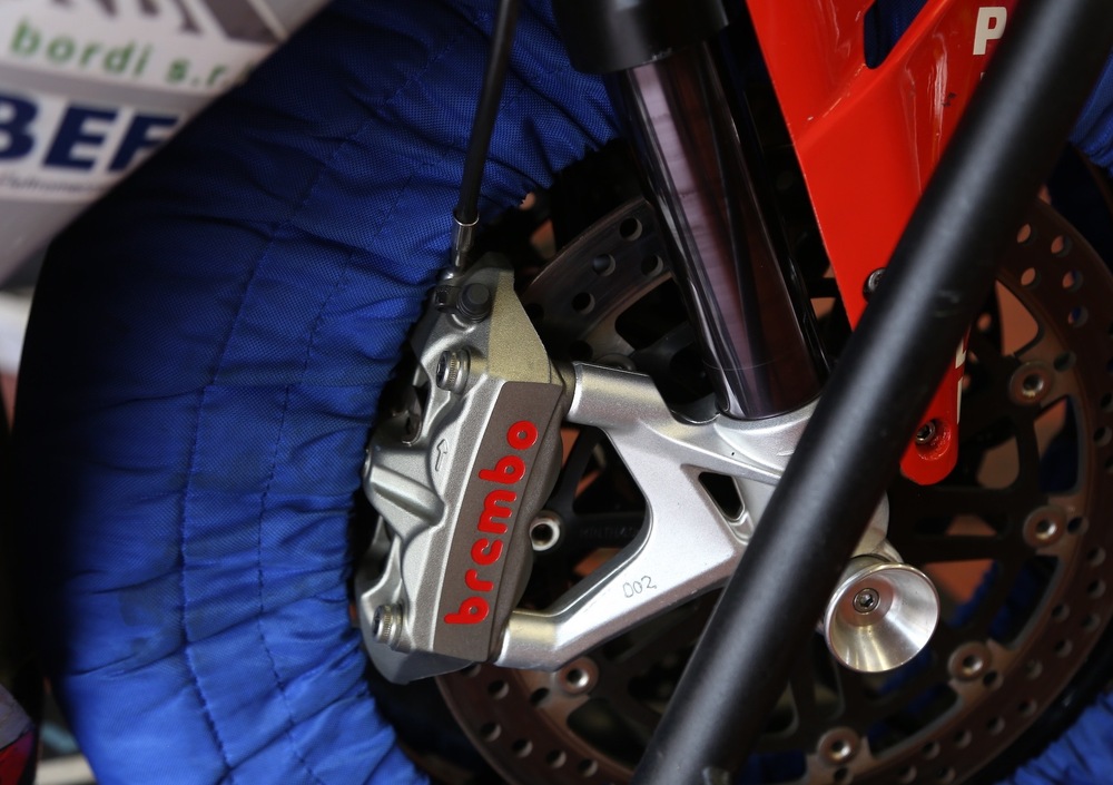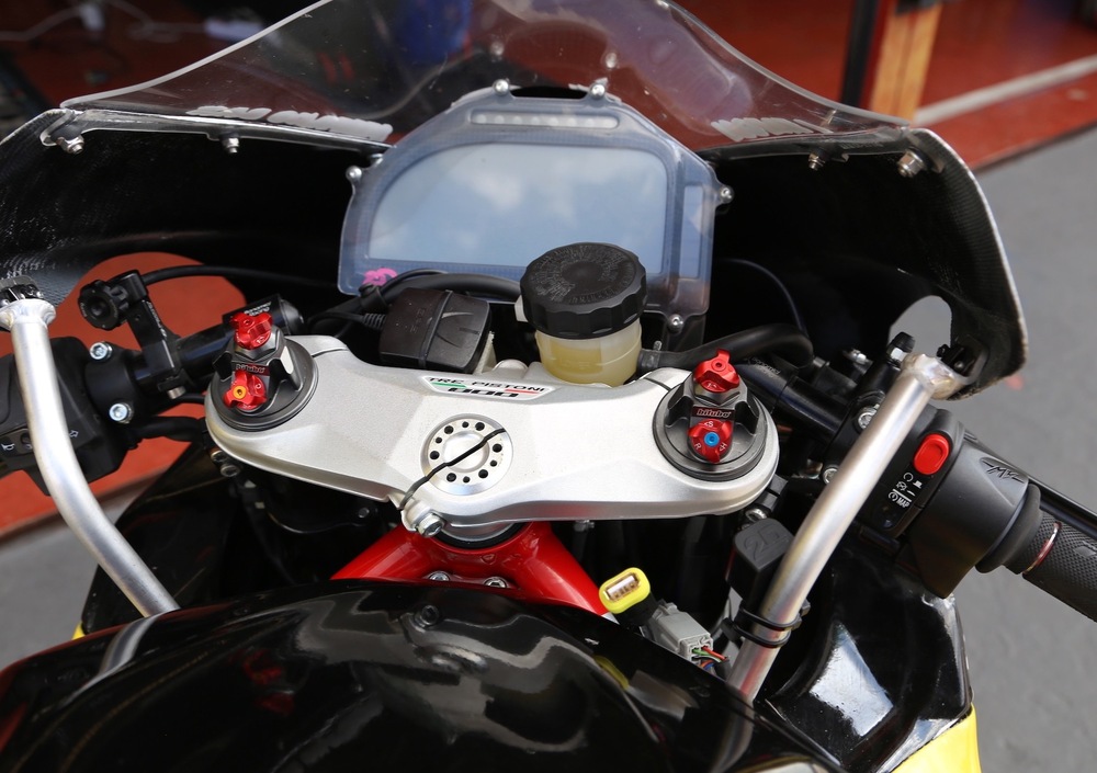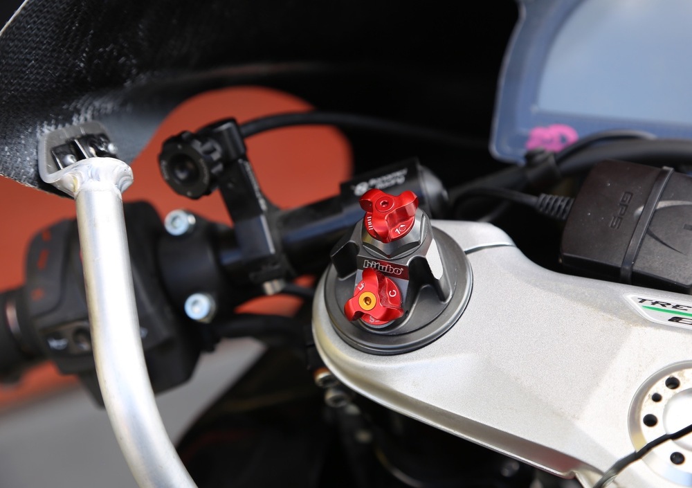 Sulla ciclistica il lavoro ha portato alla sostituzione del mono posteriore e delle cartucce forcella con unità Bitubo (semplicemente meravigliose le lavorazioni in vista, con i registri anodizzati rossi dal look professionale ed intuitivo – una manna dal cielo per chi deve lavorare di fretta in condizioni di gara), all’ottimizzazione dell’impianto frenante con pastiglie e raccordi dedicati, e alla sostituzione dell’interfaccia pilota – leve al manubrio, pedane e relativi comandi – con unità Bonamici Racing.