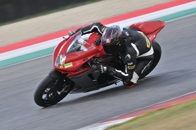Un turno di pausa, e poi si salta sulla F3 800 by Extreme Racing. La posizione di guida cambia, con la sella nettamente più alta e rigida, pedane rialzate di conseguenza e manubri forse un filo più aperti. Prima – in alto – dentro e si parte. Già percorrendo la corsia d’immissione in pista si sente un propulsore nettamente più cattivo e sostenuto già dai bassi e medi regimi, carattere sottolineato da una voce di scarico quasi erotica con il suo ringhio gorgogliante. E’ inutile, per quanto possa lavorare bene una Casa costruttrice, il solo liberare un motore dalle pastoie dell’Euro-4 lo migliora a livelli stratosferici.