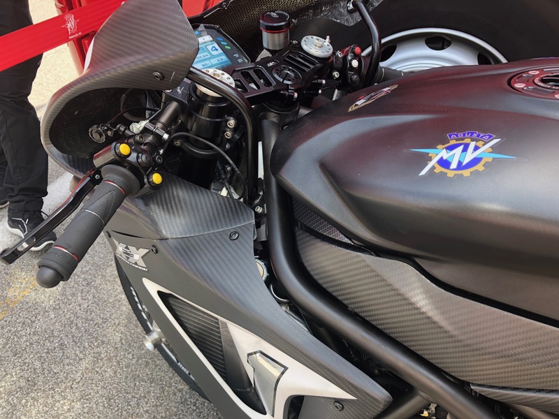 Come sempre avviene sulle moto da corsa, salire sulla F3XX è un’esperienza un po’ particolare. La sella è ancora più alta della già impegnativa F3 originale, rigidissima per trasmettere tutto di quanto succede sotto le ruote e determina un carico sui polsi rilevante, anche se le pedane sono piacevolmente meno alte di quanto mi aspettassi, viste le taglie dei piloti del team. La posizione giusta per andare forte, non certo per trotterellare nei box, come si addice a una moto da corsa vera.