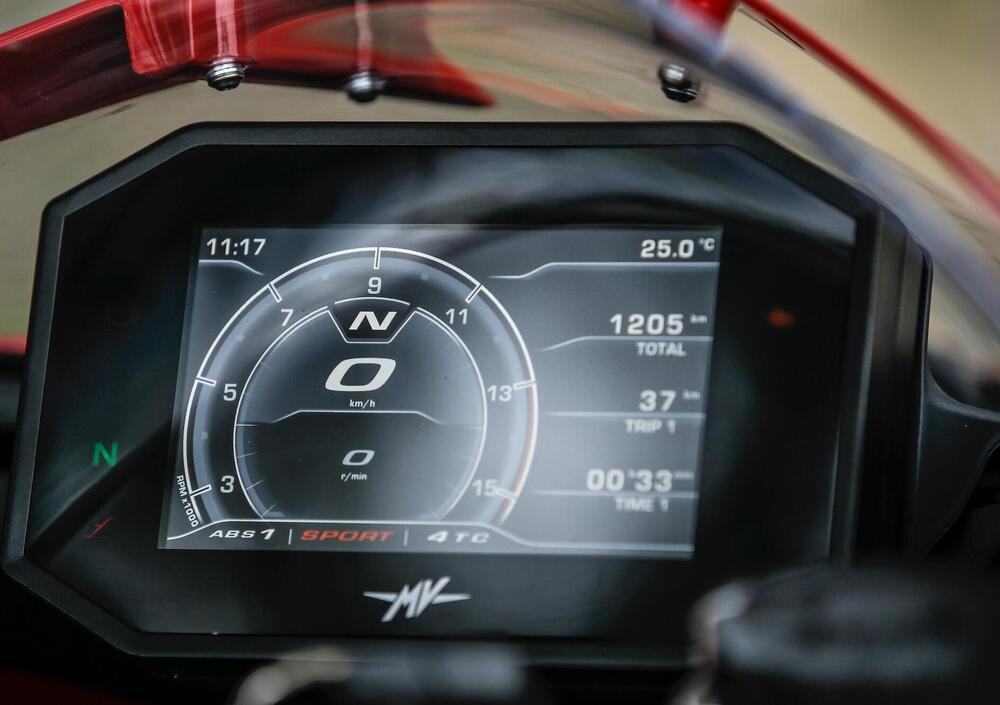 Il cruscotto TFT da 5”, che sostituisce quello LCD montato sul resto della gamma 800, è l’unità che ha debuttato sulla Brutale 1000RR.