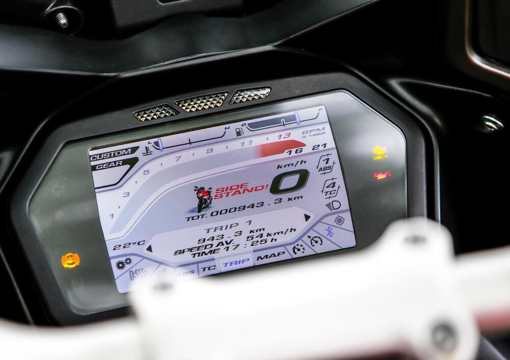 La strumentazione verte su uno schermo TFT a colori, ricco di informazioni ma a volte poco leggibili, e la navigazione nei menù è semplificata da un pratico cursore nei comandi elettrici di sinistra. Di serie ci sono il cruise control, il collegamento Bluetooth e la chiave di avviamento con immobilizer. Il parabrezza è regolabile in altezza (in maniera molto pratica) per un'escursione di 60 mm.
