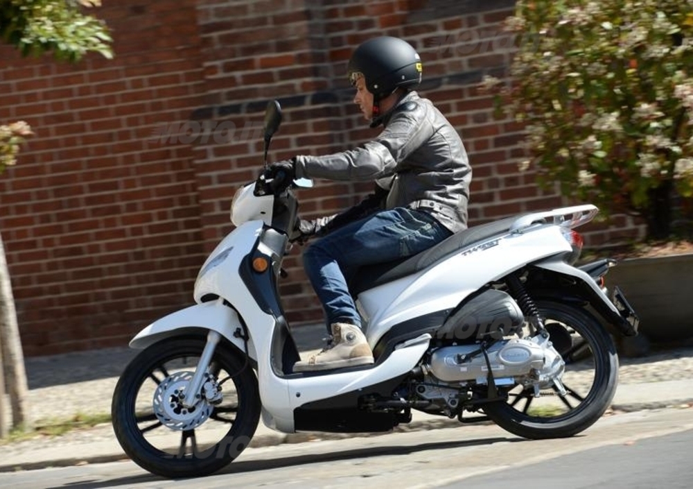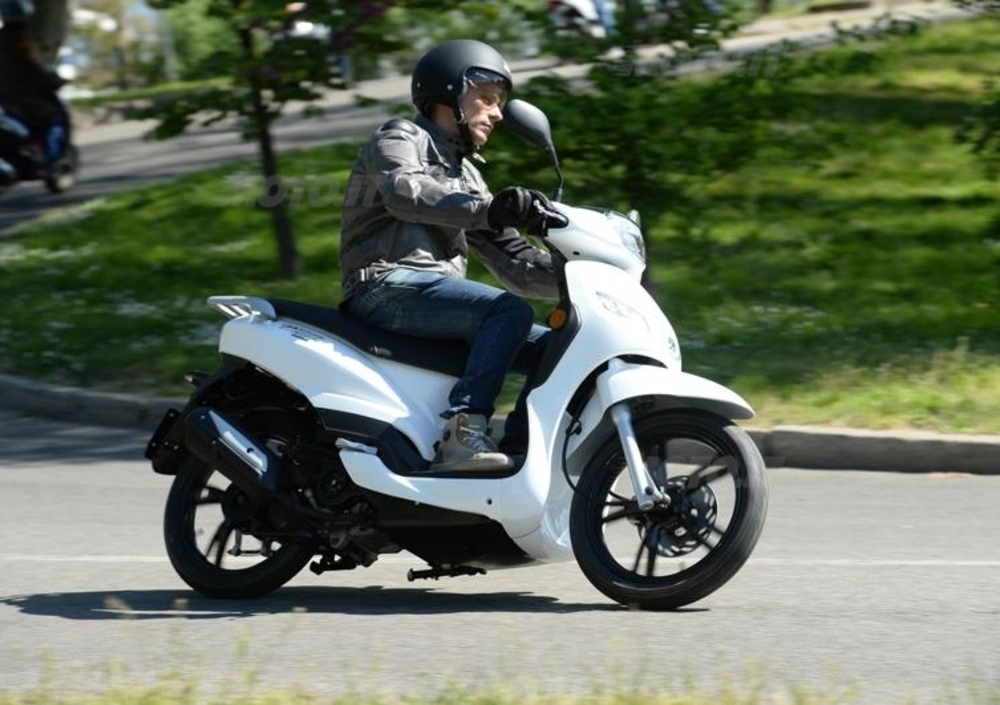 Il manubrio leggermente basso ma bensagomato ha una buona piega, cosa che, specialmente nell’uso cittadino, offre ottimo controllo. Evidente il vantaggio in fatto di stabilità delle ruote da 16 pollici, che offrono comunque una buona maneggevolezza nel traffico. Alla prima messa in moto, il motore stupisce la silenziosità dell’avviamento, che rende l’accensione silenziosa e immediata. I tre propulsori offrono prestazioni adeguate, facendo il loro dovere sia in città che fuori. Il 125 offre uno spunto di partenza e un allungo allegro, mentre il 50 va valutato nell'ambito della limitazione a velocità Codice che ne stoppa rapisamente l'allungo.