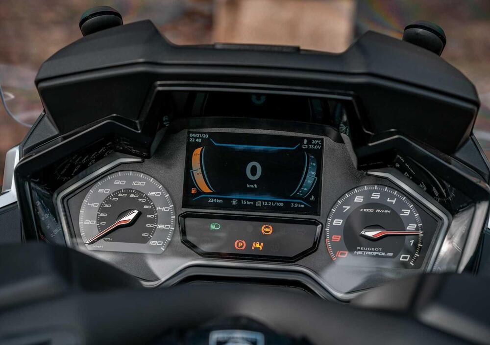 La dotazione tecnologica è di prim'ordine: smart key, blocco elettrico della sospensione anteriore per facilitare le soste, freno di stazionamento e un display TFT a colori da 5 pollici con sistema i-Connect, che permette la connessione smartphone e la navigazione "turn-by-turn". Un'ulteriore specificità del Metropolis è la sua pedana piatta, un unicum nel segmento dei tre ruote.