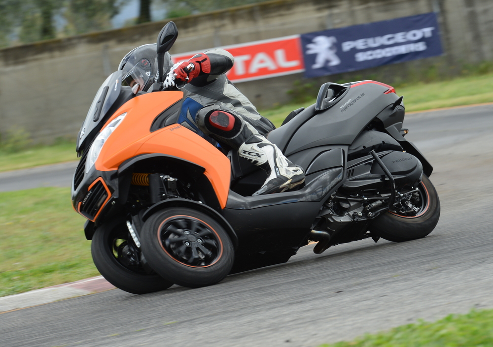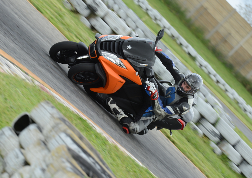 Partiamo dalla nota dolente: la frenata e l’ingresso in curva, che possono essere definiti come la parte meno incisiva del complesso. Sia chiaro, stiamo parlando sempre di guida su pista, situazione solitamente non “normale” per quando riguarda l’utilizzo di tutti i giorni. Nella seconda parte di frenata, quella a scooter piegato, le due ruote anteriori causano un sensibile raddrizzamento che rende difficile l’ingresso in curva, tendendo ad allargare la traiettoria ed obbligando il pilota ad amplificare vistosamente le manovre di inserimento in curva e di movimenti in sella.