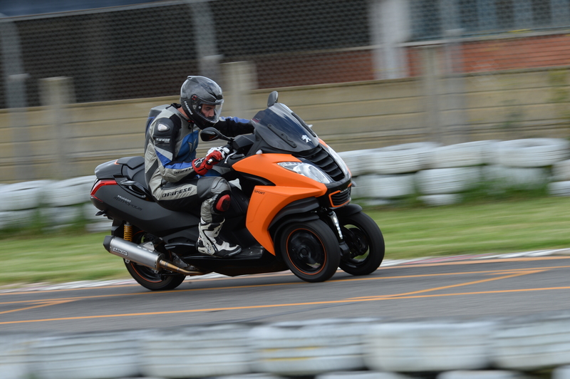 Un paio di rituali per infilarsi dentro alla tuta ed ecco che i due Metropolis Sport messi a disposizione da Peugeot Italia compaiono all’ingresso pista, pronti per dare il meglio di se. Non appena saliti in sella la mente corre immediatamente alle due ruote anteriori, riempiendo la testa di interrogativi su “come sarà guidare tra i cordoli uno scooter con una ruota in più?” È solo questione di qualche giro e già tutto sembra più chiaro. Il Metropolis funziona, nel complesso va forte e riesce a stampare un bel sorriso dietro alla visiera del casco. Ma andiamo con ordine.