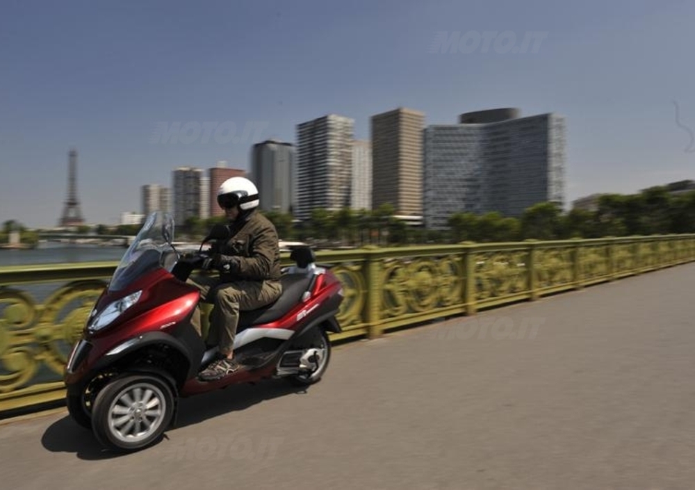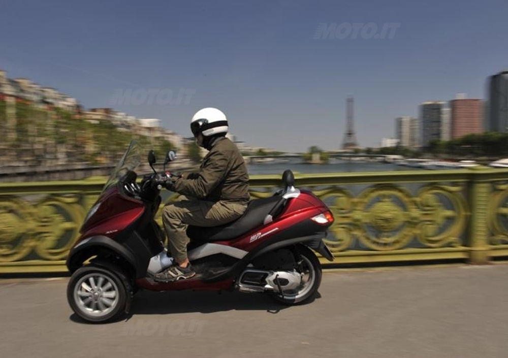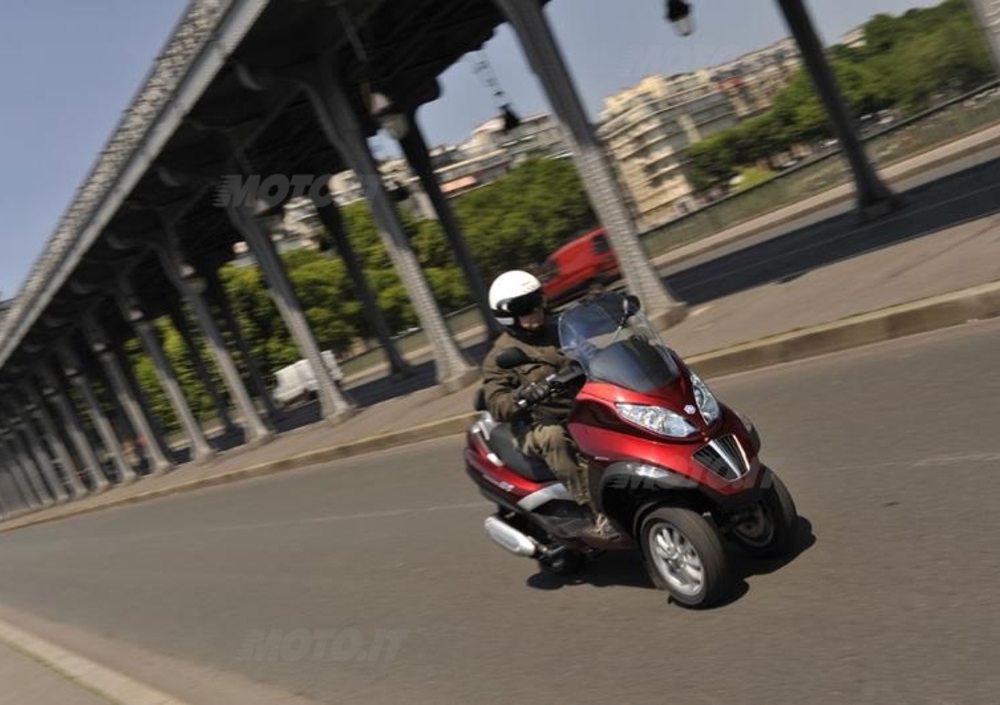 Sono molto affezionato a questo veicolo, perché comunica un livello di sicurezza – specie su fondi viscidi, specie l’odioso pavè bagnato - sconosciuto a qualunque scooter a due ruote, con un appoggio formidabile sull’avantreno e con la possibilità non solo di piegare mica male (40°, dicono in Piaggio). Dirò di più: tempo addietro, con un MP3 250, provai anche a sgonfiare quasi totalmente una delle due ruote anteriori, per vedere cosa sarebbe successo: bene, in questo caso, non si rimane a piedi, ma si riesce ancora a guidare, anche se lentamente, è chiaro.