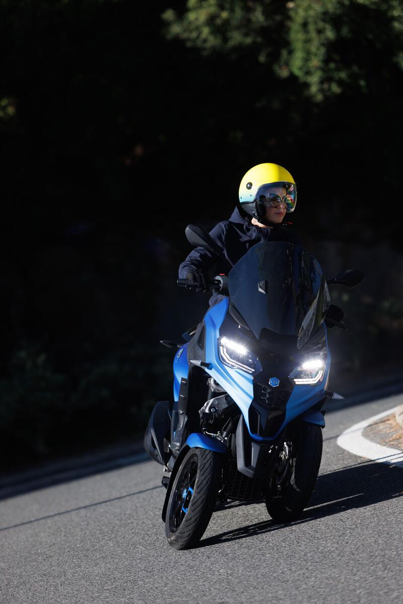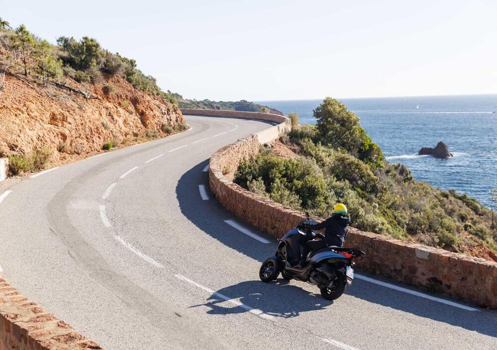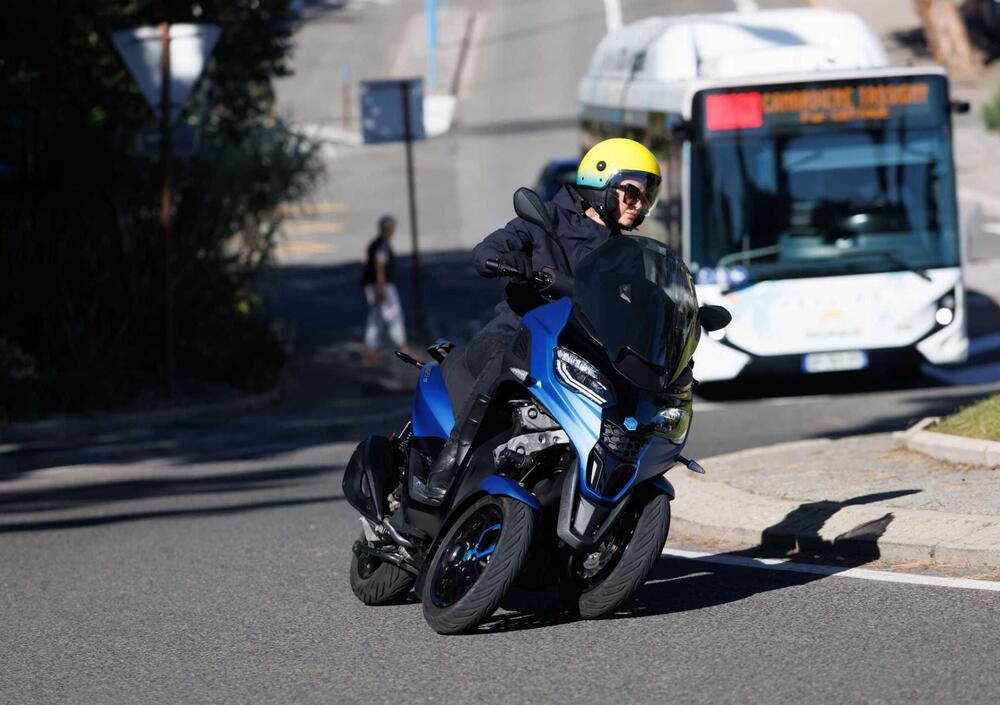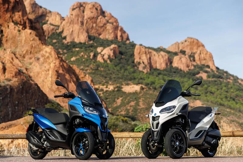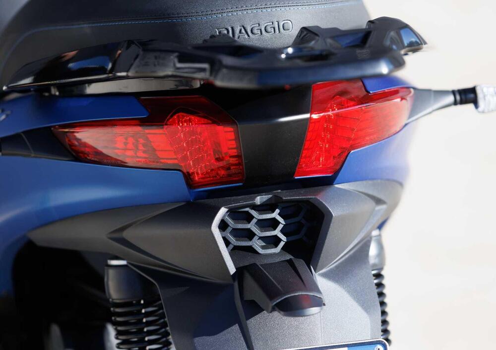 Ricordiamo anche come funziona il brevetto Piaggio delle due ruote anteriori indipendenti e basculanti, comandate dalla sospensione a quadrilatero articolato: il meccanismo di rollio è composto da quattro bracci fusi in alluminio, articolati su altrettante cerniere solidali al cannotto centrale, e da due cannotti laterali collegati ai suddetti bracci mediante perni e cuscinetti a sfere. All’interno dei cannotti laterali ruotano il tubo sterzo destro e quello sinistro, in un classico schema monobraccio.
