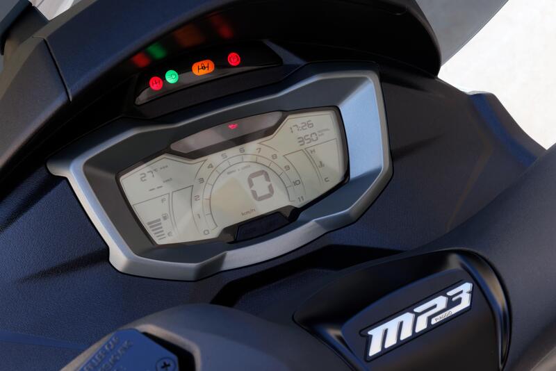 Piaggio MP3 310 è disponibile in due tinte lucide: Bianco Luna e l’inedita Grigio Grafite. Entrambe sono abbinate a nuove finiture in grigio metallico satinato. La sella è specifica, con nuove texture e cuciture grigie a contrasto in tono con le finiture. Costa 8.099 euro f.c.