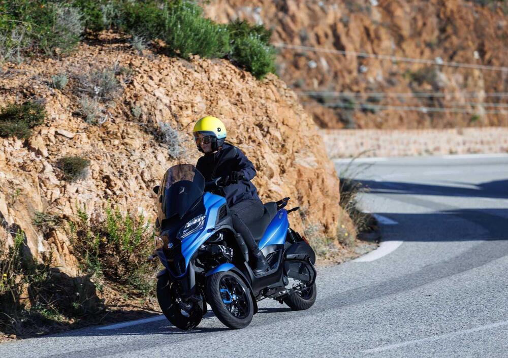 Il propulsore, naturalmente rivisto per rispondere alla normativa Euro5+, si rivela bello scattante in città e gode di un ottimo allungo ideale per chi si muove spesso su tangenziali o autostrade. Noi, per metterlo alla prova proprio dappertutto, abbiamo portato l'MP3 anche tra le curve, dove la doppia ruota anteriore ha dato il meglio di sé, concedendoci pieghe da vera sporty ride domenicale.