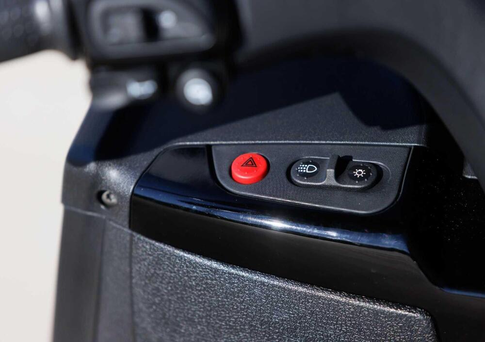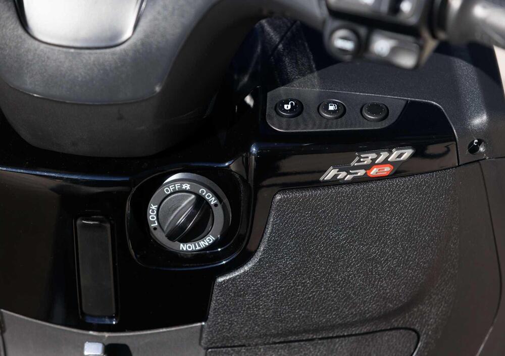 Il dispositivo di blocco della sospensione anteriore permette di portare l’equilibrio da dinamico a statico. Azionandolo, il veicolo rimane sulle tre ruote, senza necessità di dover utilizzare il cavalletto centrale, comunque presente. Per riprendere la marcia è sufficiente agire sul comando del gas o sull’apposito pulsante di sblocco.