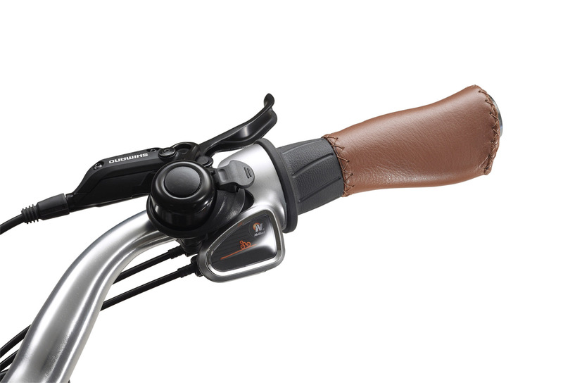 Per tutte freni a disco sempre Shimano, con anteriore da 180mm e posteriore da 160 con pinze a comando idraulico. Il telaio è un’unità completamente in alluminio realizzata in due versioni (maschile e unisex), che ospita l’unità motrice e la batteria senza soluzione di continuità. All’avantreno si può scegliere fra una forcella ammortizzata o una soluzione ad elastomeri integrata nel cannotto di sterzo. Curiosità: il telaio presenta posteriormente gli attacchi per il V-Brake. Perché? Semplice: sono richiesti per legge dalla normativa olandese, anche perché vengono sfruttati da diversi sistemi antifurto. Trattandosi ovviamente di un mercato importantissimo, i supporti sono stati integrati nella produzione del modello normale.