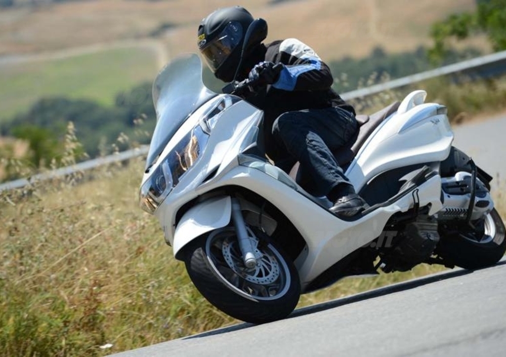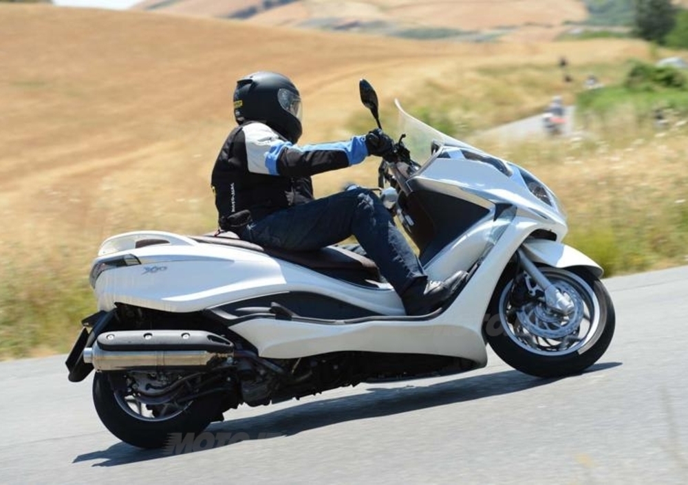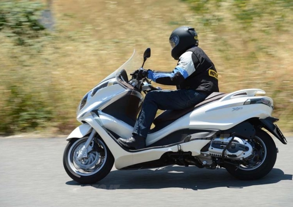 In ogni caso, sulle numerose curve dei colli lucchesi c’è da divertirsi parecchio a guidare, e l’X10 si presta piuttosto bene al gioco, con la sua ciclistica solida e stabile anche lungo curve ampie e veloci. Questo vale sul liscio, però, perché arrivando un po’ disinvoltamente su qualche tratto dissestato ecco che l’avantreno, specie chiudendo il gas, può scomporsi e ciondolare un po’. Nulla da recriminare alla forcella, però, che pur non essendo a doppia piastra (come sarebbe auspicabile su mezzi di questa stazza) lavora più che onestamente, e senza tamponare mai a fondo corsa. Che sia comodissimo regolare a piacimento la sospensione posteriore semplicemente agendo sui pulsanti, anche in movimento, ce lo aveva mostrato anche lo stesso Kymco 700. Però anche a Pontedera, come a Taiwan, hanno un po’ esagerato in rigidezza nella scelta della taratura minima, che invece sarebbe logico aspettarsi soffice e confortevole: non è certo un segreto che molte delle nostre strade – e non solo quelle cittadine - sia costellata di pavè e rattoppi molto spesso devastanti, specie per uno scooter, e di conseguenza per i suoi occupanti, passeggero in primis. Quanto ai freni, visto che le leve sono abbastanza distanti dalle manopole, sarebbe utile averle regolabili: la frenata è abbastanza gommosa inizialmente, poi progressività e potenza sono buone, ma bisogna tirare forte per ottenerne il massimo, che comunque è più che soddisfacente. Molto valido l’Abs, specie davanti; dietro, come quasi sempre accade, è invece molto più facile avvertirne l’intervento pulsante. Poco attivo l’ASR, durante il nostro giro: difficile sentirlo intervenire , se non provando a forzarlo sullo sterrato. Protagonista tutt’altro che secondario nella guida dell’X10, il Piaggio Master 500 si conferma molto valido: dolce e fluido nell’erogazione, molto silenzioso e con una trasmissione molto a punto, senza strappetti fastidiosi in partenza. Un motore dallo spunto ben calibrato e con prestazioni decisamente brillanti, visto che la velocità massima dovrebbe avvicinarsi ai 160 orari effettivi. Davvero godibile, e, come già detto, molto ben isolato dalla carrozzeria, tanto da viaggiare come sul velluto, l’ottimo monocilindrico consuma anche poco, visto che al termine del nostro giretto il pc di bordo indicava una media di 24,5 km/litro: con i 13,5 litri disponibili prima della riserva (2 litri), di questo passo si dovrebbero dunque percorrere almeno 330 chilometri.