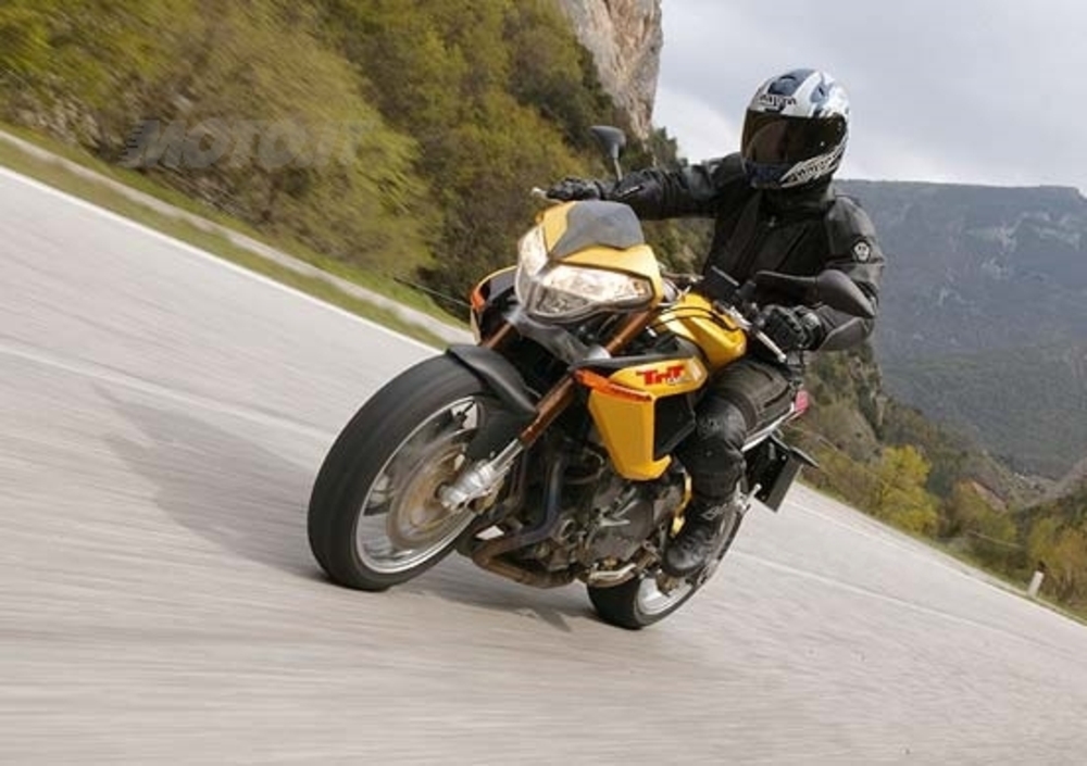 Le dimensioni sono raccolte, come la posizione in sella, che anticipa le caratteristiche dinamiche della TNT. Accensione, quatto chiacchiere con i colleghi, motore che entra in temperatura, via giù dalla strada che porta fuori dal parcheggio dell’albergo. Primo rettilineo, prima apertura di gas a gomme fredde...apperò, la piccola ha un bel caratterino, basta guardare la striscia nera sull’asfalto per capire che c’è polpa da spremere . I promettenti dati dichiarati sulla scheda tecnica, vengono confermati alle prime aperture di gas. Al primo stop, i commenti sono unanimi: alla faccia della coppia!