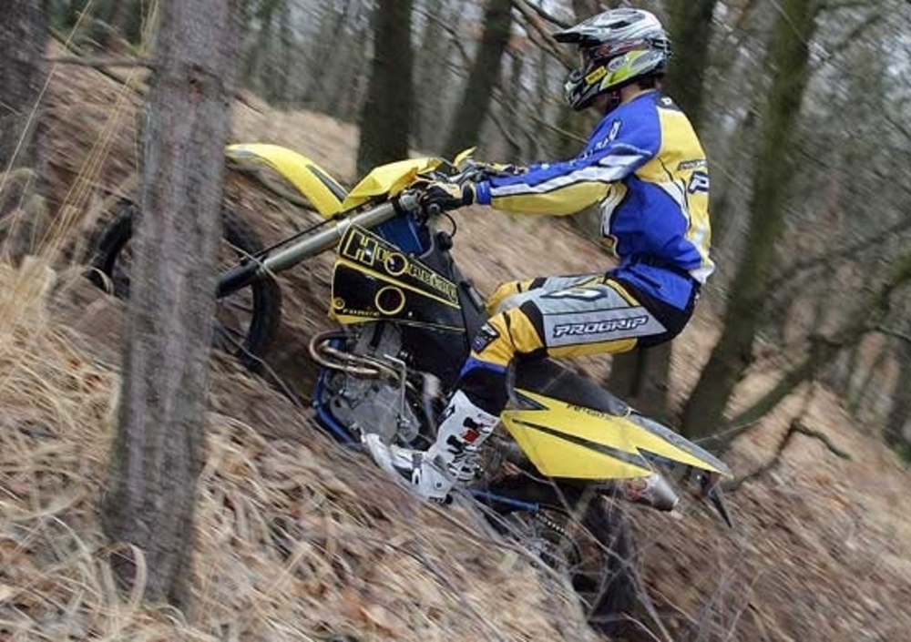 Per quanto riguarda le sospensioni WP, l’anteriore da 48mm di diametro lavora molto bene sui terreni tipici da enduro. Nelle pietre e nel sottobosco mi ha trasmesso sicurezza e mi ha sempre assecondato negli spostamenti, senza mai farsi “sentire” nelle braccia. Il PDS, con nuovo setting per il 2005, mi ha dato l’impressione di essere un po’ morbido sul veloce. Molto libero nel ritorno, facilita la trazione nelle zone lente, ma quando si prende una certa velocità risulta essere parecchio ballerino e, soprattutto in staccata, sembra scalciare, caricando eccessivamente l’avantreno e scombinando i pesi. Per il ‘05 è stato introdotto anche un nuovissimo forcellone, che aumenta del 30% la sua resistenza alla torsione, pur essendo più leggero del 30%. Ho litigato spesso con il cavalletto laterale, d’obbligo su tutte le enduro, ma in questo caso in una posizione che può risultare d’intralcio nella guida.