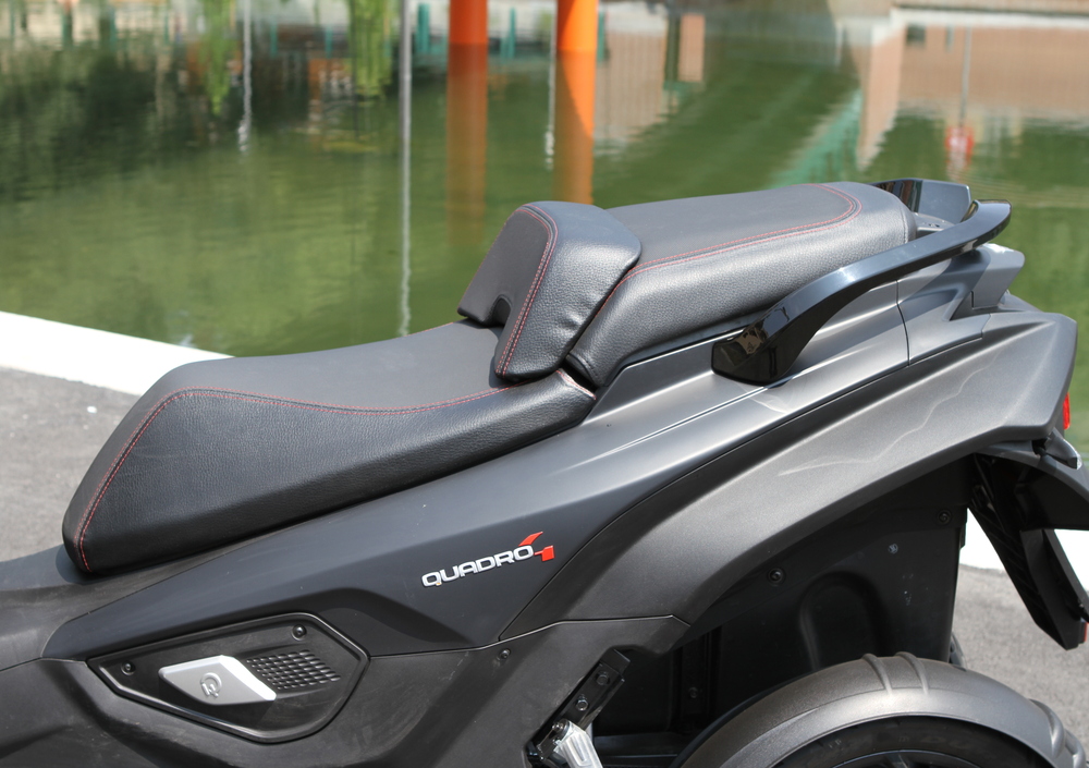 In sella al Q4, comunque sia, si sta molto comodamente in due, anche se la possibilità di stendere le gambe, per chi guida, è forzatamente ridotta a causa dell’avantreno tecnicamente ingombrante: il pilota ha comunque la facoltà di aggiustarsi longitudinalmente il supporto lombare, alla ricerca dell’ergonomia ottimale. Una sella comoda e piatta (che quindi non tende a far scivolare pian piano in avanti chi guida, come spesso fastidiosamente accade sugli scooter): ma anche parecchio ampia, al pari della pedana, il che probabilmente non aiuterà i più bassi di statura nel poggiare i piedi a terra, se non sedendosi il più avanti possibile.