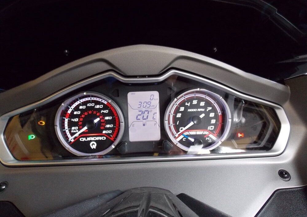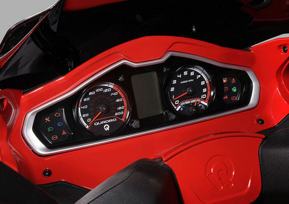 Visto di fronte, il Quadro4 è facilmente confondibile col 350S: quindi il musetto ospita un poderoso impianto illuminante alogeno con due fari polielissoidali inferiori abbaglianti e due superiori anabbaglianti, in entrambi i casi funzionanti contemporaneamente, con alle estremità superiori le lucine diurne a led. Immutate anche le piccole “frecce”, parimenti a led. Il tutto sovrastato da un bel parabrezza scuro, non regolabile in altezza. Chiaro che la vista posteriore sia invece completamente differente: in bella evidenza figurano infatti due ruote motrici, e più sopra spicca un largo fanalino multi-led. Girando attorno al veicolo, oltre alle pedanine posteriori in lega leggera, sul lato destro si nota la maniglia che aziona il freno di stazionamento, ben incastonata appena sotto la sella del pilota. All’estremità anteriore della pedana, poi, figura il pedale che comanda la frenata combinata, sistemato il più avanti possibile per non disturbare la posizione del piede.