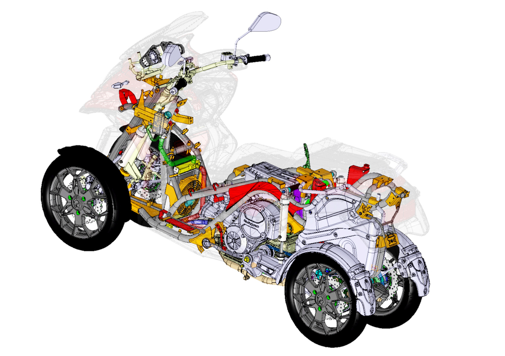 Quanto alla struttura portante del veicolo, si tratta di un traliccio in tubi d’acciaio che ingabbia saldamente il motore. Naturalmente l’apparato sospensivo, qui logicamente duplicato rispetto al “fratello” a tre ruote, è costituito dalla struttura oleopneumatica a ruote indipendenti HTS (Hydraulic Tilting System, brevetto mondiale) sia anteriormente che dietro. Quindi abbiamo due coppie di ammortizzatori ad aria e olio che lavorano in compensazione: in soldoni, in fase di piega, gli elementi di sinistra si comprimono mentre i destri si estendono, e viceversa. Va sottolineato che, rispetto al prototipo protagonista del famoso video del 2010, il Q4 attuale ha subito sostanziali variazioni, in particolare riguardanti le carreggiate anteriore (parecchio più ridotta) e posteriore. Le quote attuali sono infatti di 570 mm anteriormente, e di 455 dietro, il che risponde alla domanda che forse tutti ci siamo chiesti: come mai il Quadro 4 è omologato come “triciclo”? Semplice, quanto abbastanza buffo: la carreggiata posteriore è inferiore ai 460 mm, quota sotto la quale il legislatore (non chiedeteci perché, per pietà…) considera le ruote come “gemellate”, quindi comparabili ad una sola ruota… La larghezza dell’anteriore, invece, abbinata alla presenza anche dell’impianto frenante a pedale, consente di guidare il veicolo con la patente B.