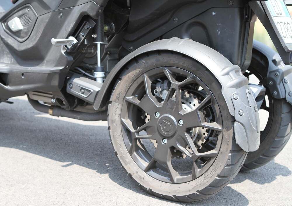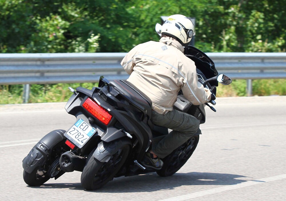 Come spiegato nel paragrafo dedicato alla tecnica, l’apparato frenante offre diverse opportunità d’utilizzo. Perlomeno all’inizio, chi è abituato all’auto probabilmente prediligerà il pedale, che però ha una corsa corta e non vanta un’azione molto progressiva sui quattro dischi disponibili; inoltre è duretto, quindi va premuto con forza per ottenere il massimo, con risultati comunque piuttosto soddisfacenti. Usando solo la leva destra sul manubrio, che comanda i due dischi anteriori, si ottengono invece decelerazioni poco incisive, utili solo per rallentare a bassa velocità. A nostro avviso, l’opzione migliore è dunque sfruttare la frenata combinata con la leva di sinistra, anch’essa duretta e gommosa da azionare, ma che offre decelerazioni brillanti, e vien più naturale per gli scooteristi abituali. Naturalmente è possibile usare anche leva e pedale contemporaneamente, ma va tenuto presente, come già accennato, che un sistema respinge l’altro: così può accadere che la pressione sul pedale respinga quella sulla leva, o viceversa, a seconda dello sforzo attuato sull’uno o sull’altra.