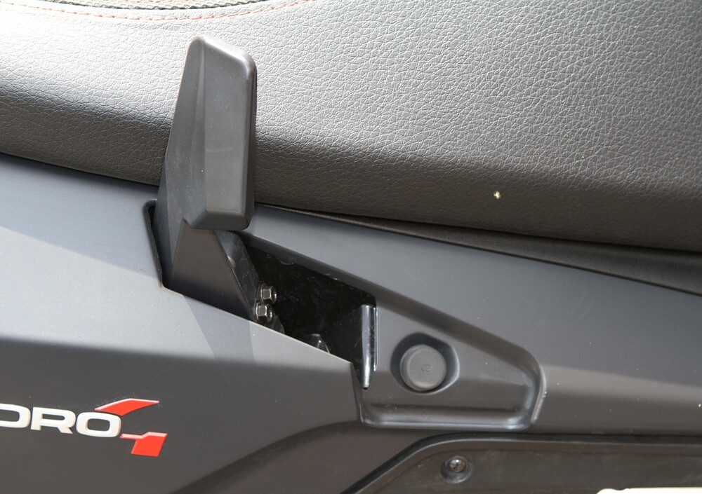 Il retro scudo invece ospita al centro la leva dal manico rosso che blocca meccanicamente lo scooter in verticale, alla cui destra è presente un piccolo portaoggetti discretamente profondo. Più in basso, come sul 350 a tre ruote, figura lo sportellino (abbastanza propenso ad aprirsi, sullo sconnesso) di un altro portaoggetti, sviluppato in larghezza più che in profondità, ma con all’interno una seconda presa a 12 Volt, tipo accendisigari. Ancora più sotto figurano due tappi oblunghi in gomma, che coprono altrettante feritoie: togliendoli, in inverno è possibile usufruire del calore proveniente dal radiatore, specialmente usando la copertina coprigambe.