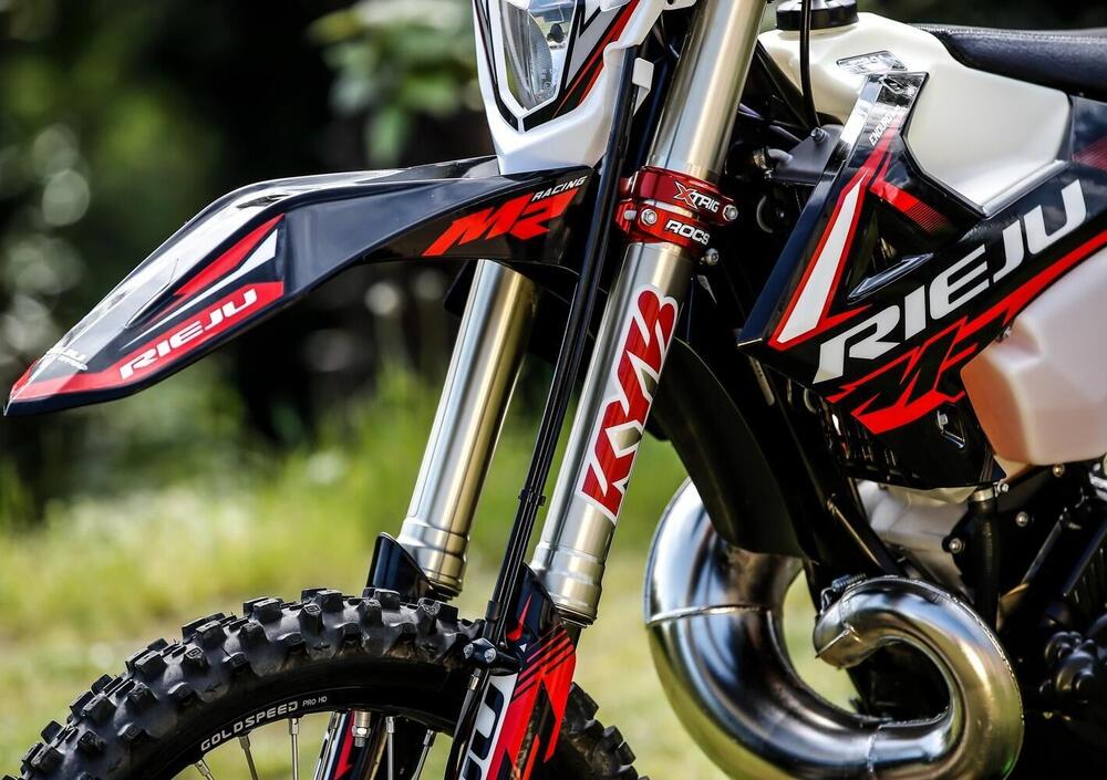 Sul modello di punta della ditta spagnola abbiamo il top di gamma su ogni elemento della componentistica. Sali in sella e sai subito di essere su una moto pronto gara. Sella alta 960 mm da terra, manubrio con piega dritta ed alta, distanza sella, pedane, manubrio davvero ottima. La forcella Kayaba da 48 mm con trattamento DLC ed escursione da 300 mm per aumentarne la scorrevolezza, unita a questo telaio rende la PRO veramente stabile soprattutto sul veloce, in particolare sulle buche a scalino che vengono copiate molto bene anche in velocità grazie alla buona trazione del mono. Questo aspetto trasmette molta fiducia in termini di guida e ti permette di osare sempre di più e di avere sempre la moto “in mano” e la situazione sotto controllo. Dal punto di vista termico abbiamo un propulsore molto sornione e progressivo nella prima parte di erogazione e poi, nella zona dell’apertura della valvola diventa sorprendentemente potente ed esplosivo. Su questo aspetto, personalmente preferisco maggiore equilibrio, ma questa caratteristica è facilmente personalizzabile grazie alla possibilità di variare di parecchio la risposta del motore grazie alla selezione della mappatura al manubrio. Nella versione nuvoletta, l’intervento dell’elettronica è evidente e taglia in maniera importante nel punto di apertura della valvola dove questa 300 tende a diventare esplosiva. Questo aspetto rende la progressione della schiena di potenza molto più lineare, ideale per i terreni scivolosi e le situazioni più estreme. In questa versione Rieju ha optato per un carburatore più grande, sempre Keihin ma diametro 38 mm.