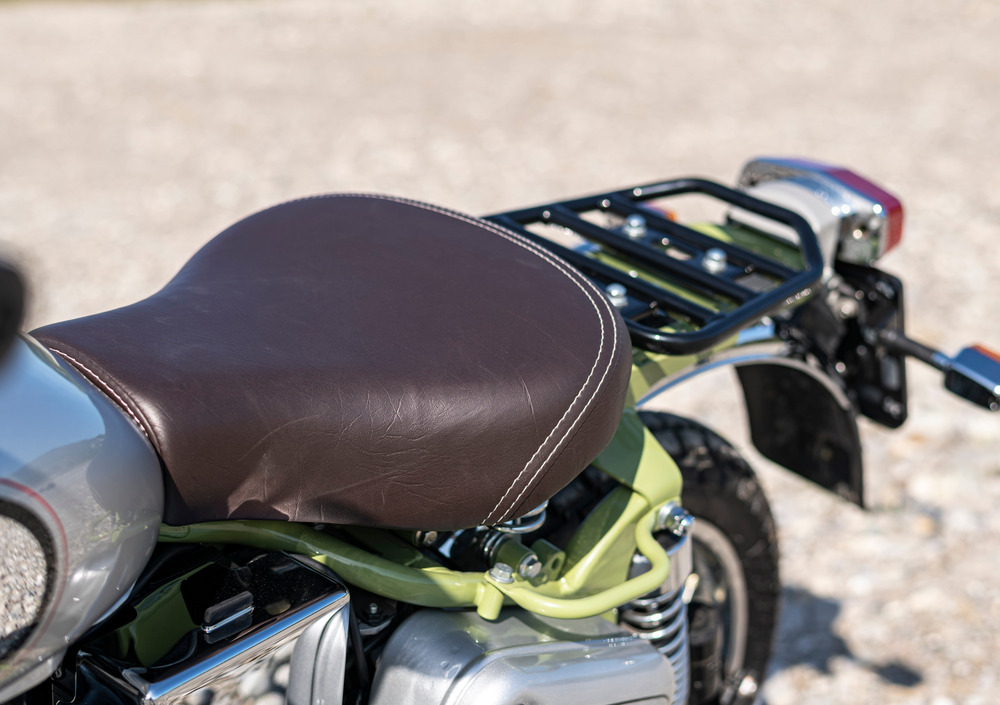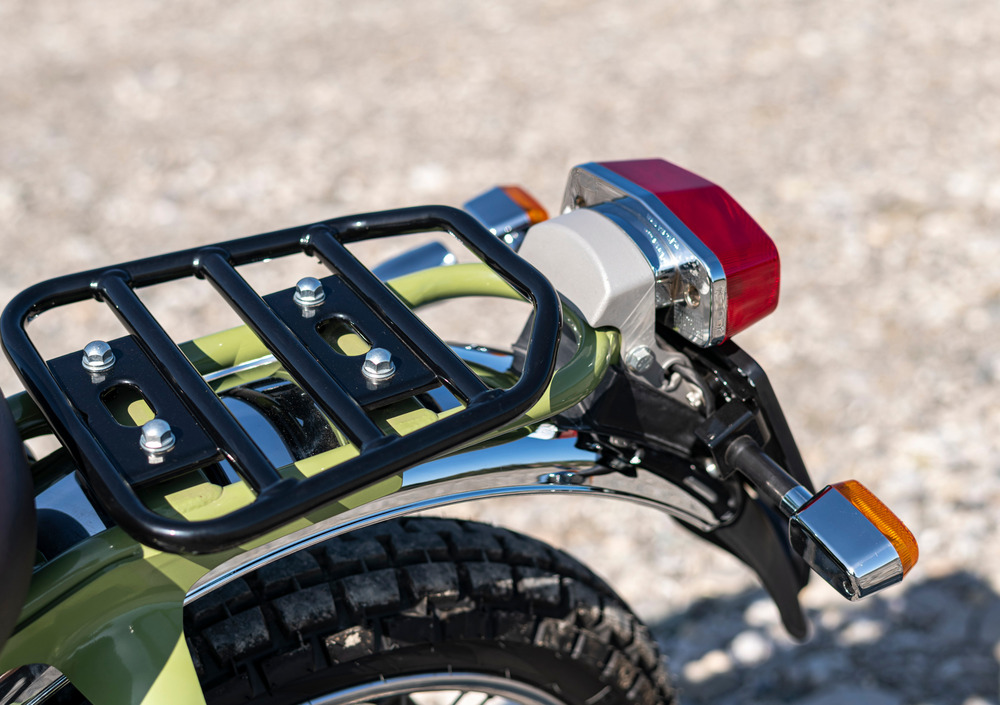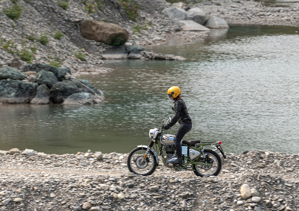 I dettagli salienti che la distinguono dalla Bullet e che la rendono unica saltano subito all'occhio e sono gli pneumatici tassellati per portare le ruote - a raggi - anche fuori dall'asfalto, il manubrio rialzato con traversino per guidare comodi anche in piedi, lo scarico alto, il portapacchi posteriore che può trasportare un carico di 15 chili.