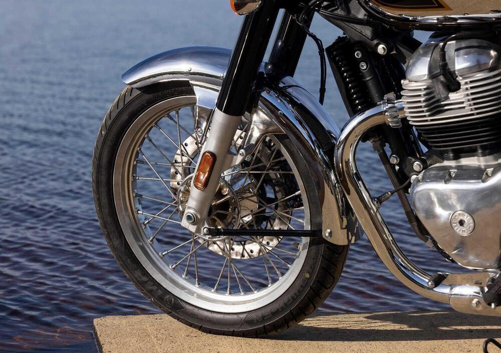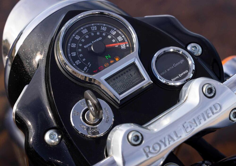 Per il resto la dotazione con i parafango in metallo come la struttura a copertura del gruppo ottico anteriore, l'impianto di illuminazione a LED (ma non gli indicatori di direzione) e l'abbondanza di cromature fanno molto nel portare in alto la qualità percepita. Da notare le leve al manubrio regolabili, la bella verniciatura goffrata del telaio (ma altre versioni hanno in telaio in tinta con il serbatoio) e i cerchi a raggi che però non sono tubeless. La strumentazione è formata da uno strumento analogico circolare coadiuvato da un piccolo pannello LCD con tutte le informazioni essenziali; sulla destra troviamo anche il piccolo display circolare del navigatore turn-by-turn Tripper e come d'abitudine su molte Royal Enfield c'è sia il cavalletto centrale che quello laterale, oltre a una presa USB-C accanto la leva della frizione.