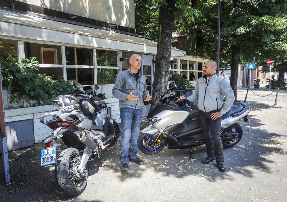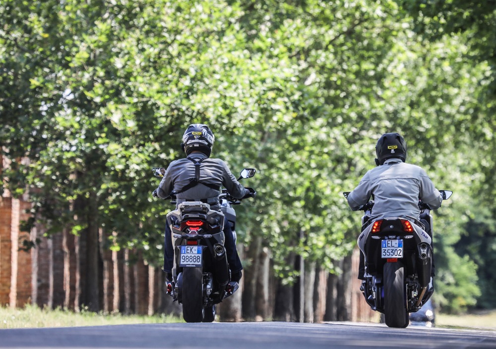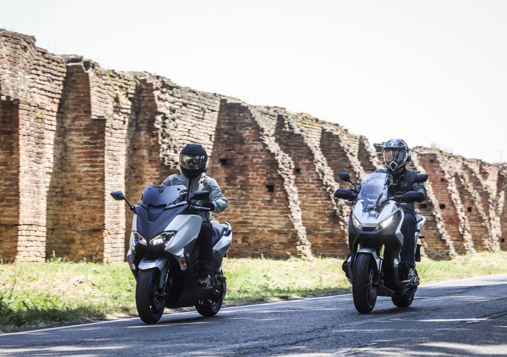 Cosa c'entrano l'X-ADV e il TMAX? Poco sulla carta. Entrambi hanno un motore bicilidrico parallelo, ma Honda sfodera 745 cc e 55 cavalli, Yamaha soltanto - si fa per dire - 530 cc e 46 cavalli. Il primo affronta addirittura il fuoristrada (leggero), mentre il secondo fa vanto della sigla Sport (ma per l'asfalto).